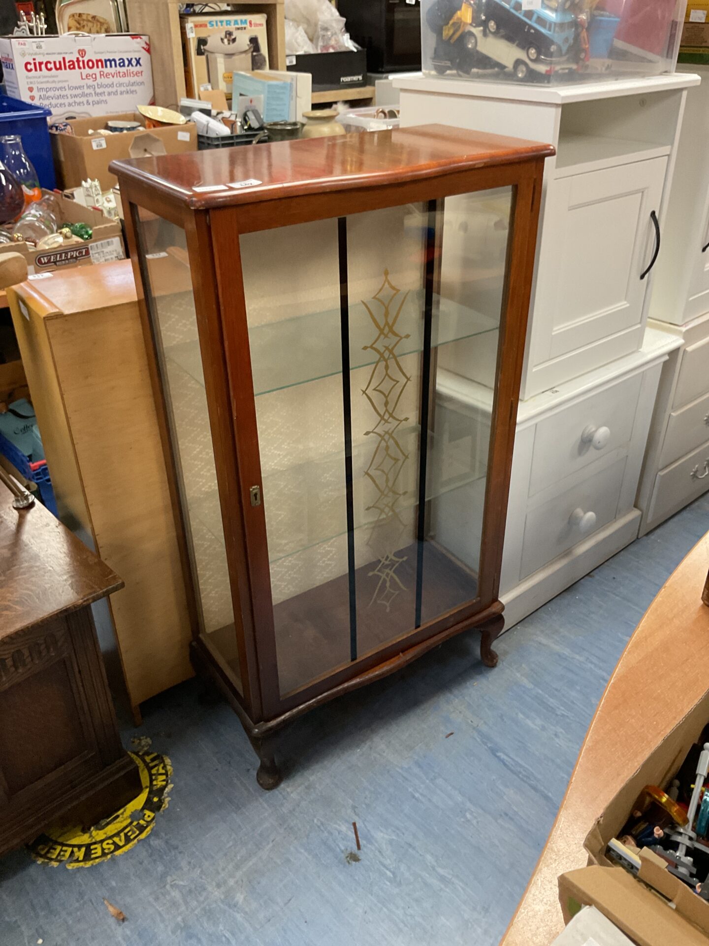 This elegant display cabinet dates back to the 1930s, crafted from rich mahogany wood. The cabinet features a beautifully glazed door, allowing for clear viewing of displayed items. Its classic design and warm wood tone make it a versatile piece suitable for a variety of interior styles, perfect for showcasing collectibles, china, or treasured possessions.