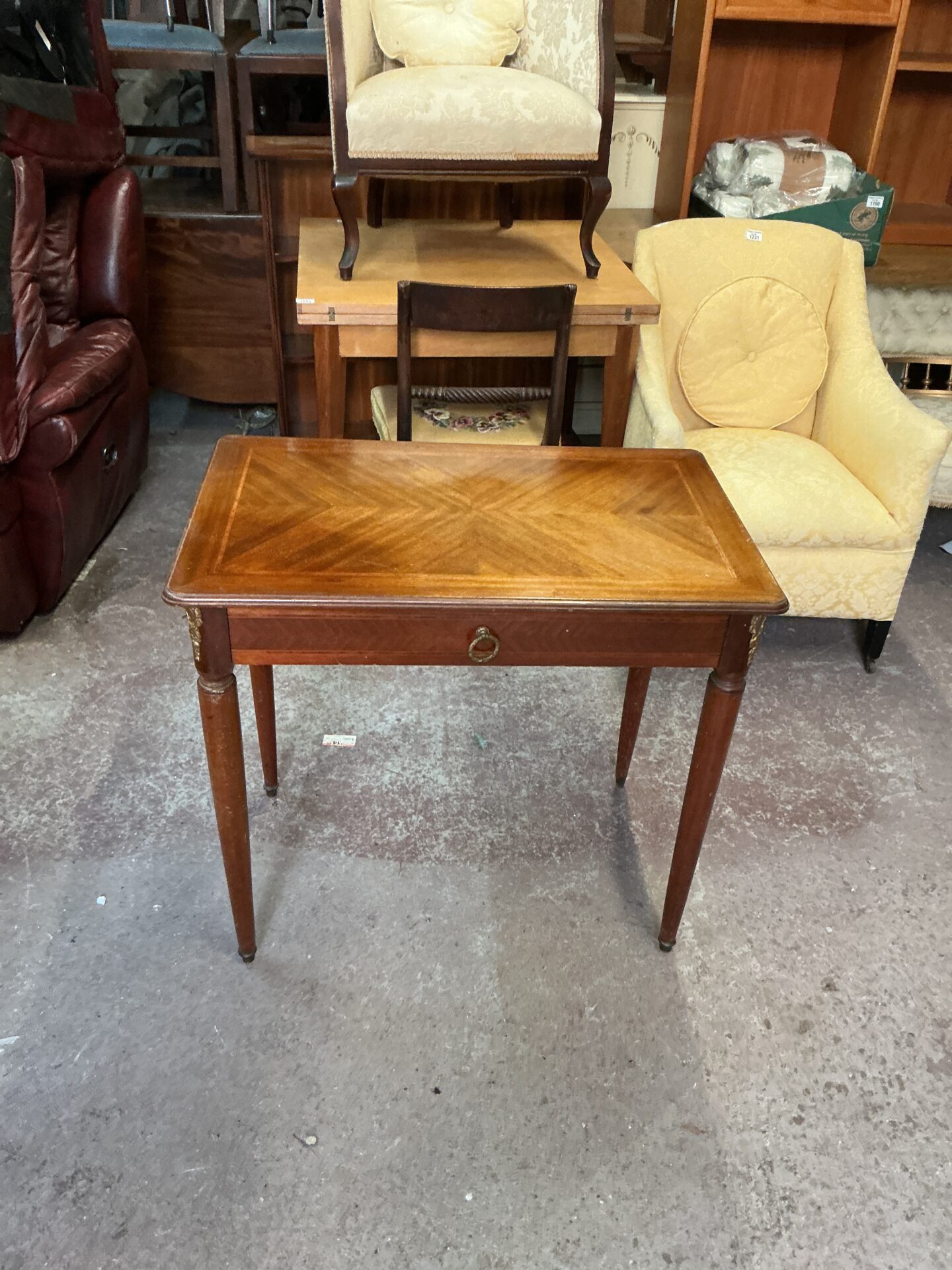 This elegant hall table features a rich mahogany finish and intricate inlaid detailing across the surface. The table’s design suggests a late 18th or early 19th-century aesthetic, with gently curved legs and a refined silhouette. It is ideal as a statement piece in an entryway, hallway, or as a side table in a living room, offering both functionality and decorative appeal.