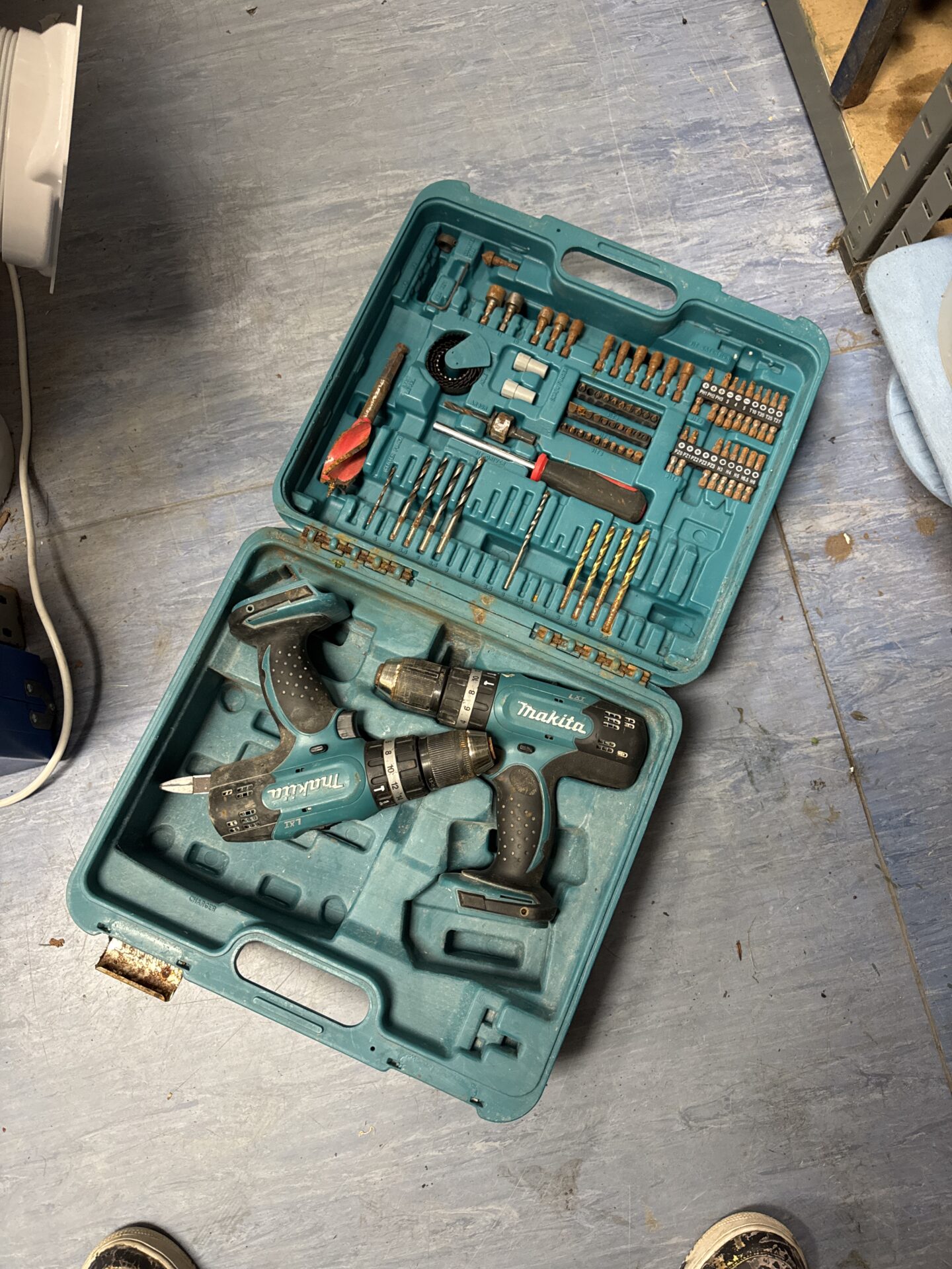 The drills and accessories appear used, with signs of wear consistent with previous use. The case itself shows some wear and tear. This lot may appeal to collectors of power tools, those seeking spare parts, or individuals looking to expand their existing Makita cordless tool collection.