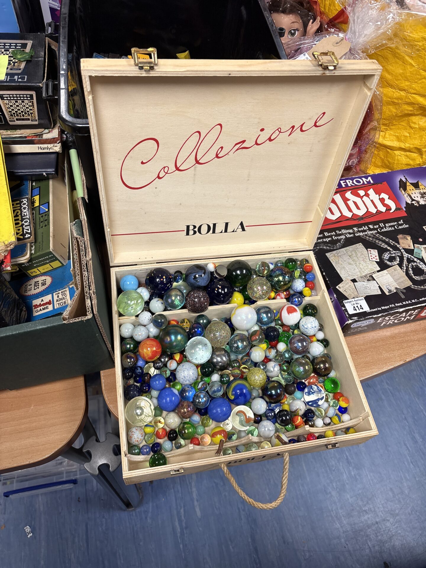 This lot presents a colourful collection of glass marbles, varying in size and design. A charming piece of nostalgia, these marbles would appeal to collectors or those seeking unique decorative elements. Displayed as found, they offer a glimpse into the history of marble making and play.
