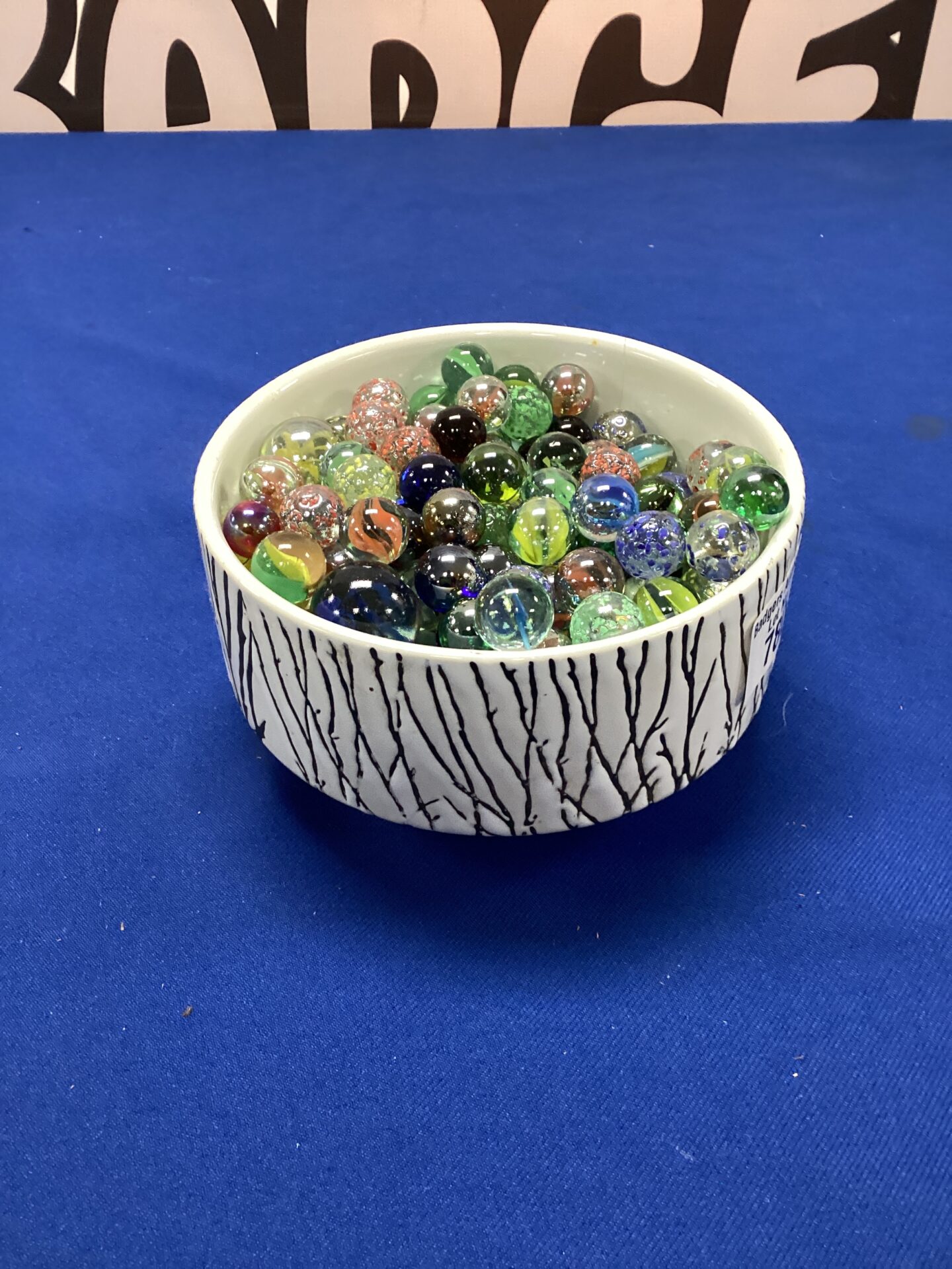 The marbles and bowl appear to be in good condition, showing signs of wear consistent with age and use. This lot would appeal to marble collectors, those interested in vintage toys, or anyone seeking a decorative item for display. The combination of marbles and bowl adds to its visual appeal and potential as a charming collectible.