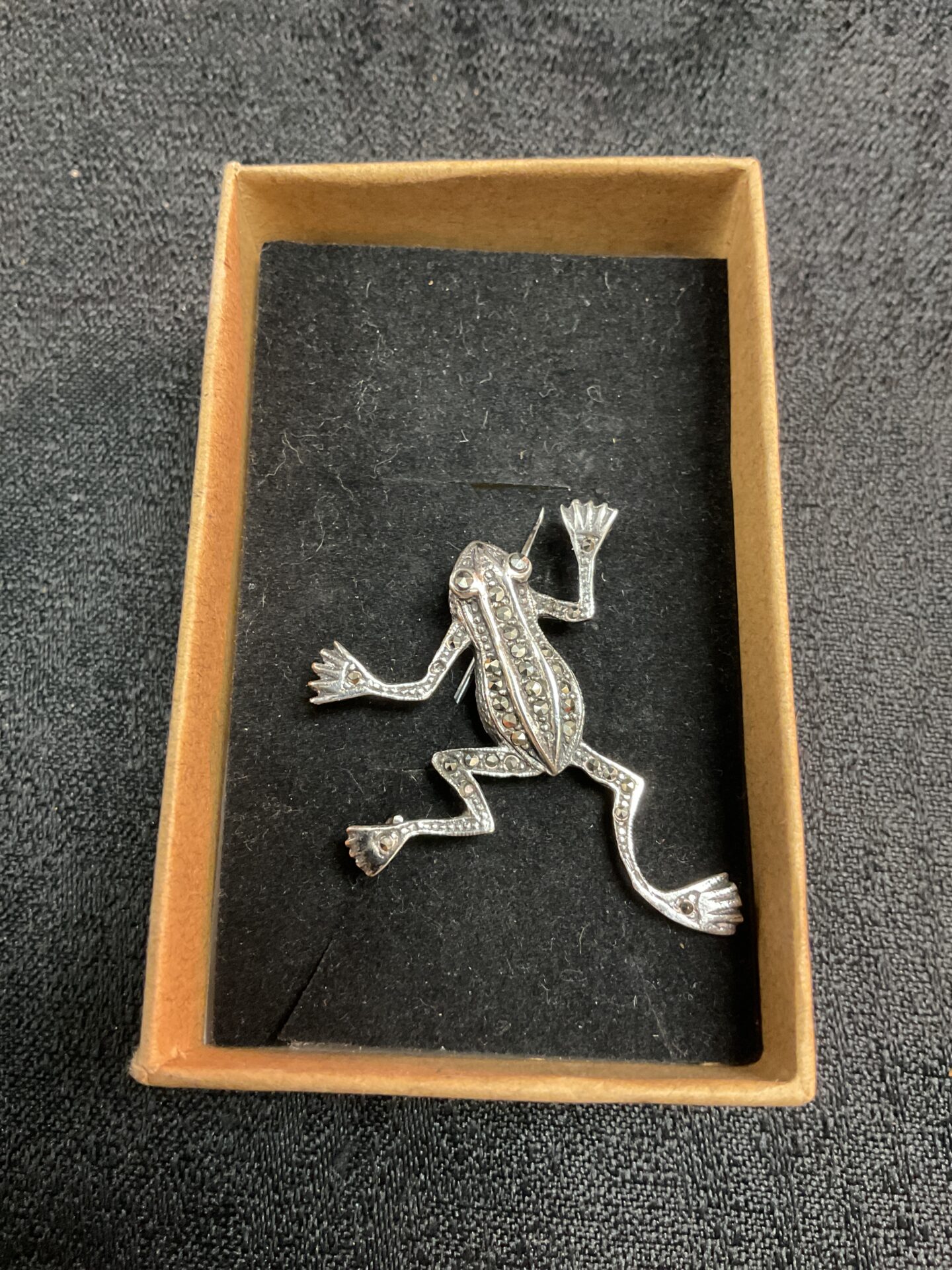 This vintage brooch features a charming frog crafted from 925 sterling silver and sparkling marcasite. The intricate design and retro style make it a unique addition to any jewellery collection. A delightful piece for collectors or those seeking a statement accessory.