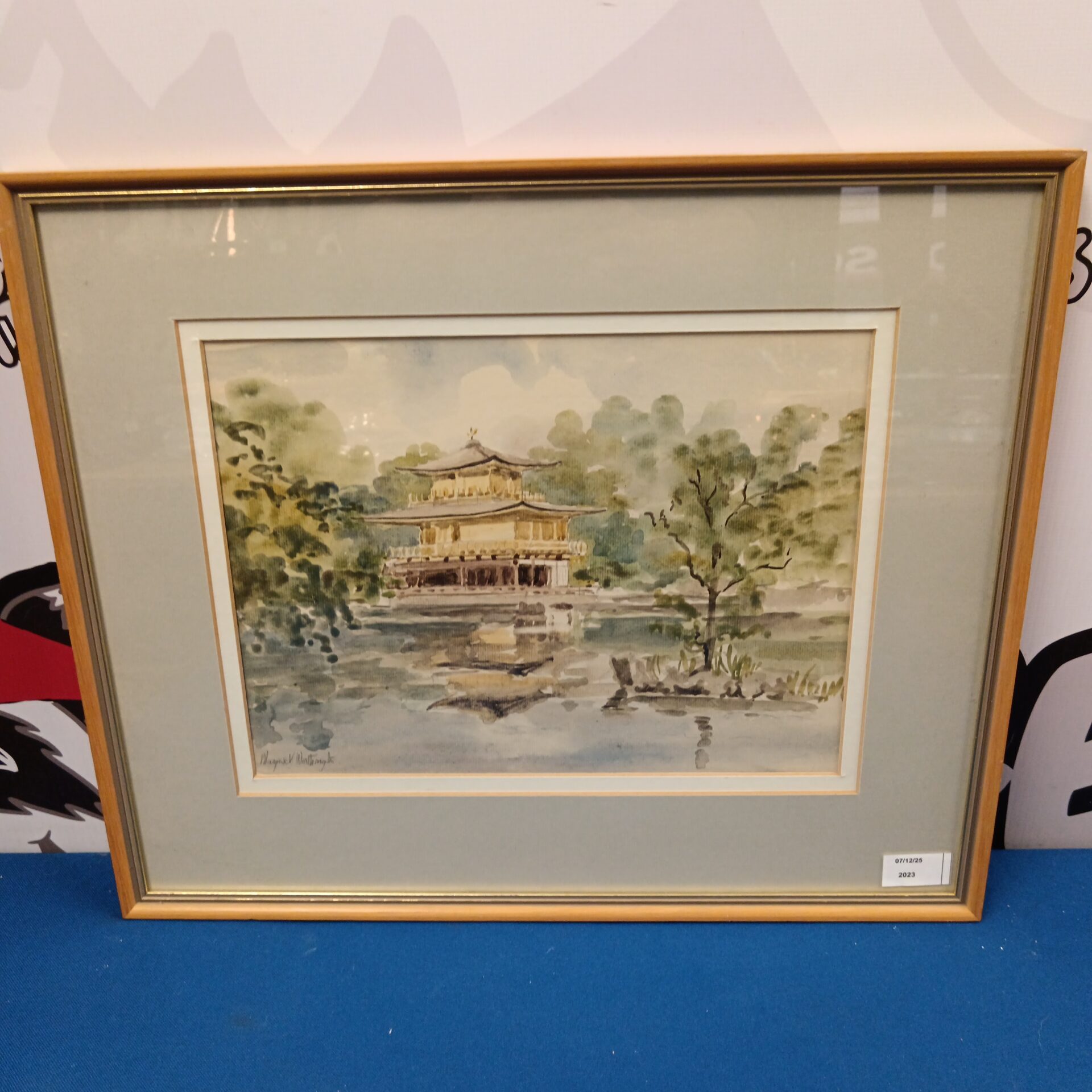 This is a delicate watercolour painting by Margaret Worthington, depicting a traditional Japanese temple nestled within a lush landscape. The artist has skillfully used washes of colour to create a serene and atmospheric scene, capturing the architectural details of the temple and the surrounding foliage with a soft, impressionistic style. The painting is signed by the artist, adding to its collectability and authenticity.