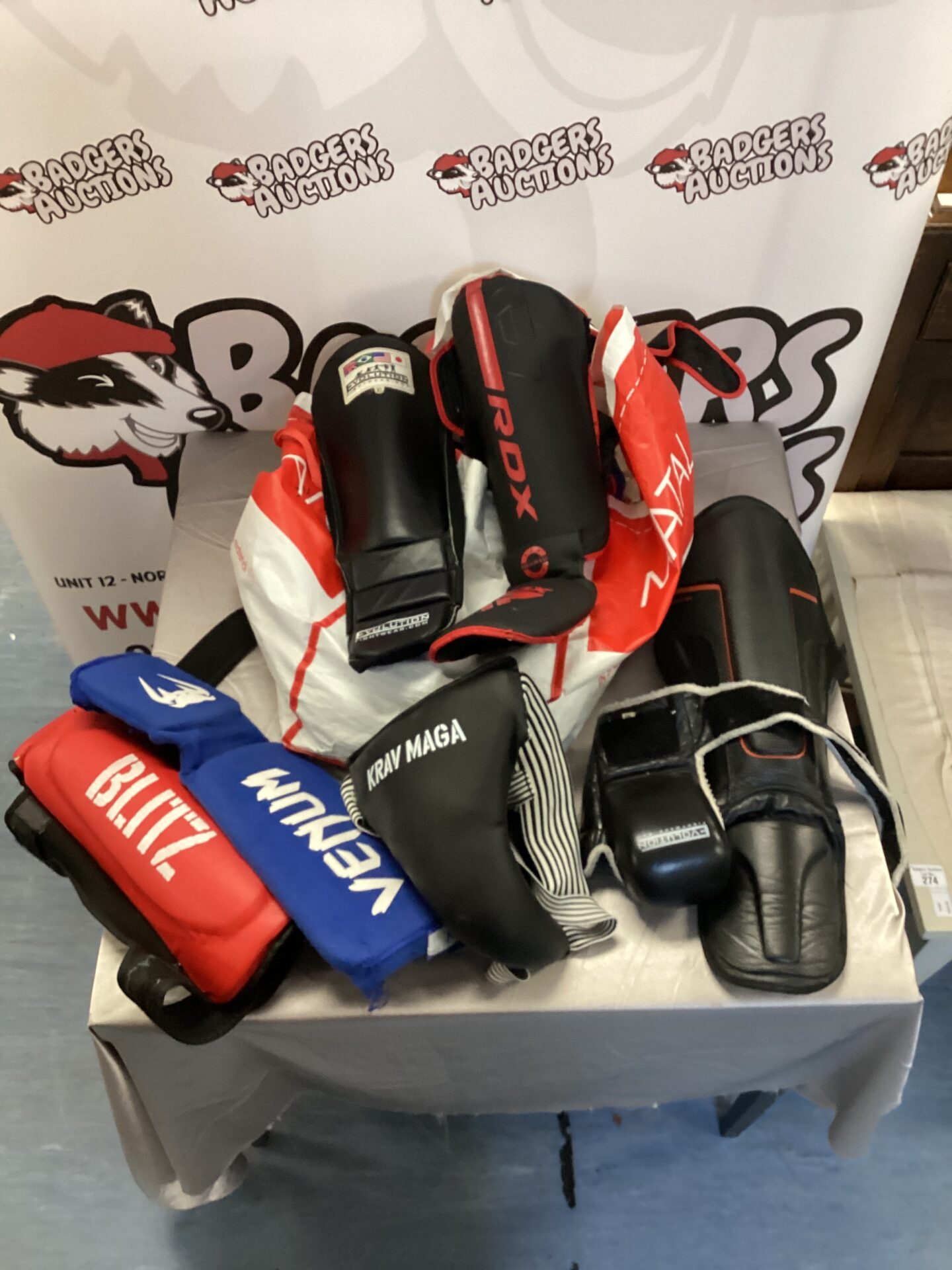 This lot contains a collection of martial arts sparring pads, designed for impact absorption during training. These pads appear to be constructed from durable synthetic materials, with a focus on providing cushioning for strikes and kicks. The pads are designed for use in various martial arts disciplines, including boxing, kickboxing, and mixed martial arts, offering a versatile training tool for athletes of all levels.