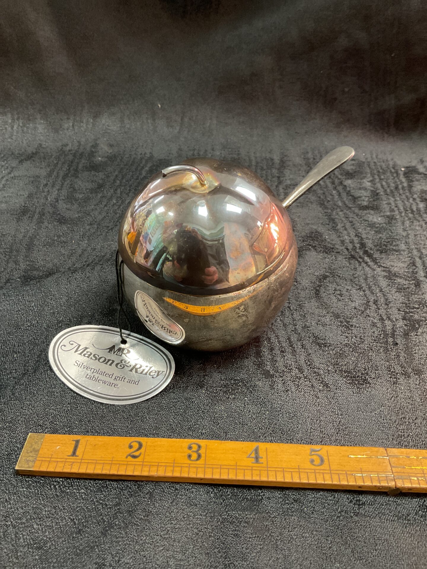 This charming apple sauce pot is crafted by Mason & Riley, renowned for their quality silver plate tableware. The pot features a delightful apple form, complete with a stem handle and a removable lid. It comes with its original spoon, perfect for serving this classic accompaniment. The detailed craftsmanship and unique design make this a beautiful addition to any dining table or silver collection.
