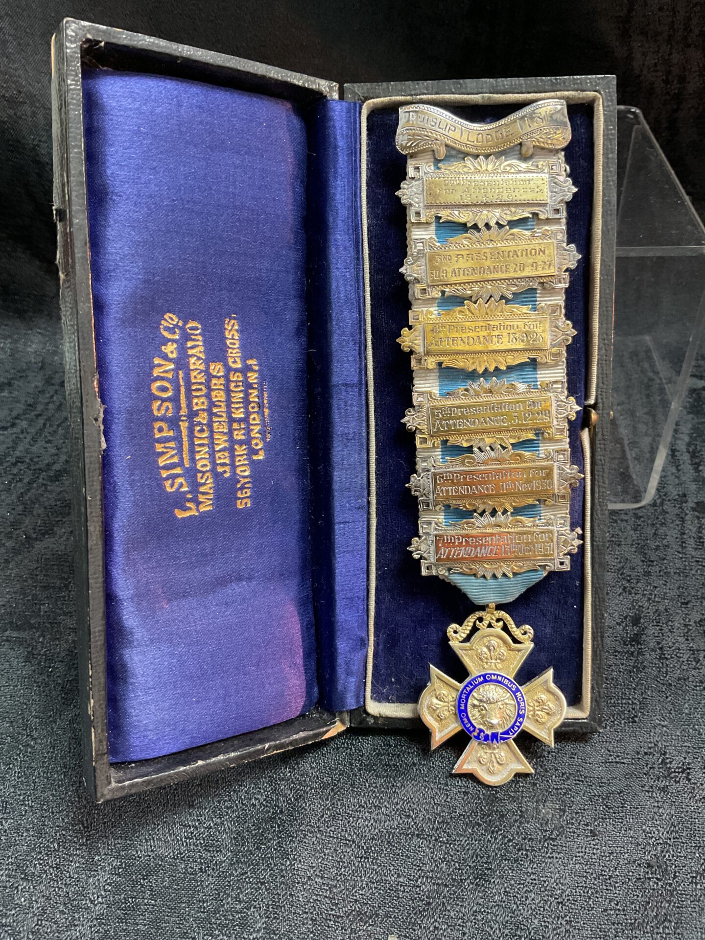 The jewel shows signs of age and wear consistent with its age, which is to be expected. It presents well and would be a desirable addition to a collection of masonic items. The presence of the attendance bars adds to its historical significance and collectibility, offering a glimpse into the dedication of its original owner.