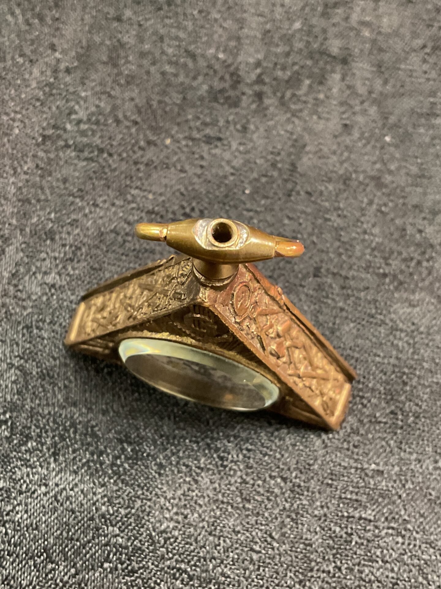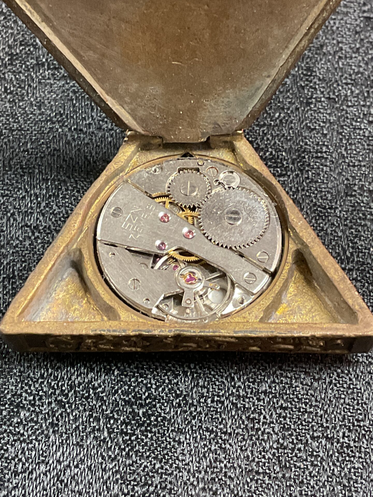 This unusual triangular pocket watch features Masonic symbolism and a visible ‘Zeel’ movement. The antique timepiece presents with signs of age and wear, making it a unique collectible for enthusiasts of fraternal history and horology. A fascinating piece for collectors or those interested in unusual timepieces.