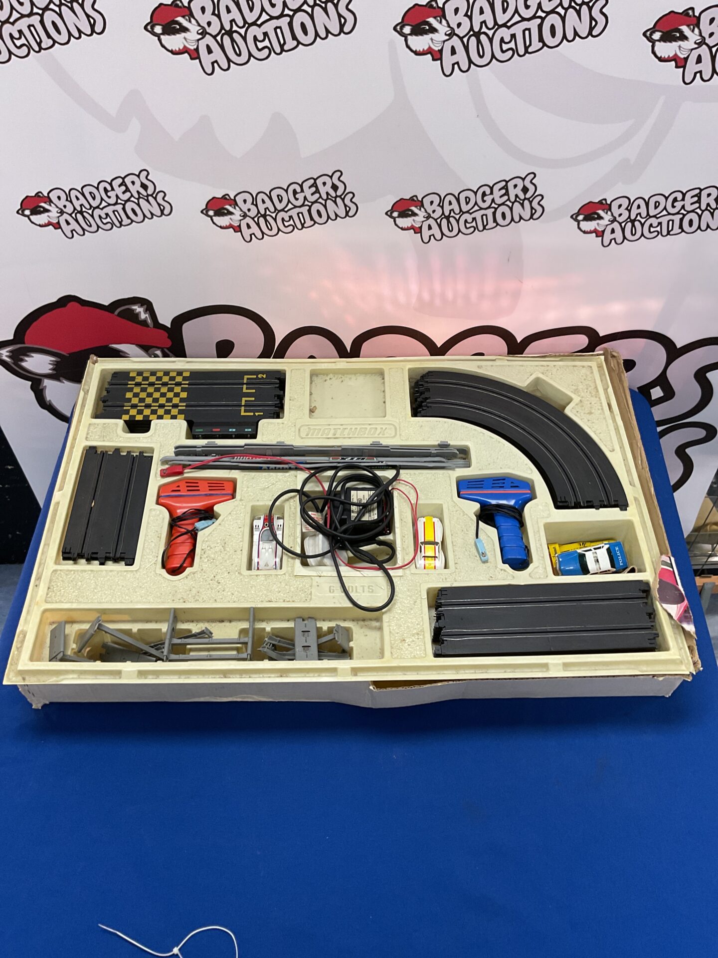 This PowerTrack 4000 appears to be a vintage example, showing signs consistent with age and previous use. The track sections, power base, and accessories are present, though their operational status is unknown. This set would appeal to collectors of vintage toys, Matchbox enthusiasts, or those seeking a nostalgic piece of their childhood.