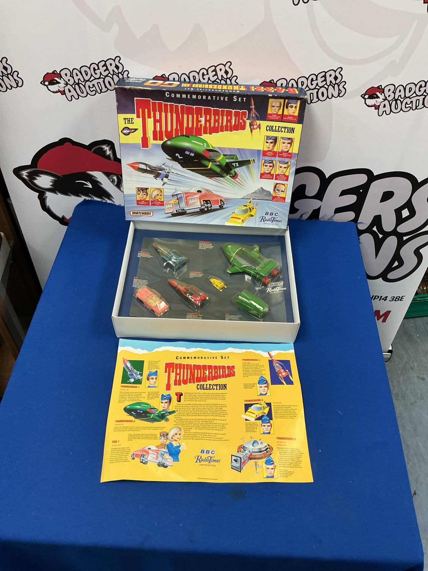 This is a Matchbox Thunderbirds Commemorative Set, a nostalgic tribute to the classic 1960s British science fiction television series. The set features detailed diecast models of iconic vehicles from the show, capturing the spirit of adventure and technological innovation that defined Thunderbirds. This set is a wonderful piece of television history, appealing to fans of the show and collectors of diecast vehicles alike.