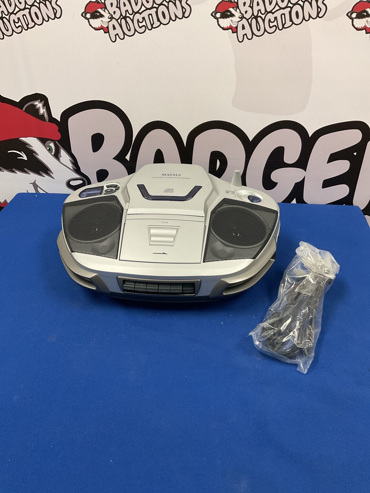 This is a Matsui CD20 CD radio cassette recorder, a classic portable audio device from the late 20th century. It combines a CD player, cassette deck, and AM/FM radio into one convenient unit. The device features a top-loading CD mechanism, auto-reverse cassette playback, and a built-in speaker, making it ideal for enjoying music on the go or at home. Its compact size and user-friendly controls make it a versatile and enjoyable listening experience.