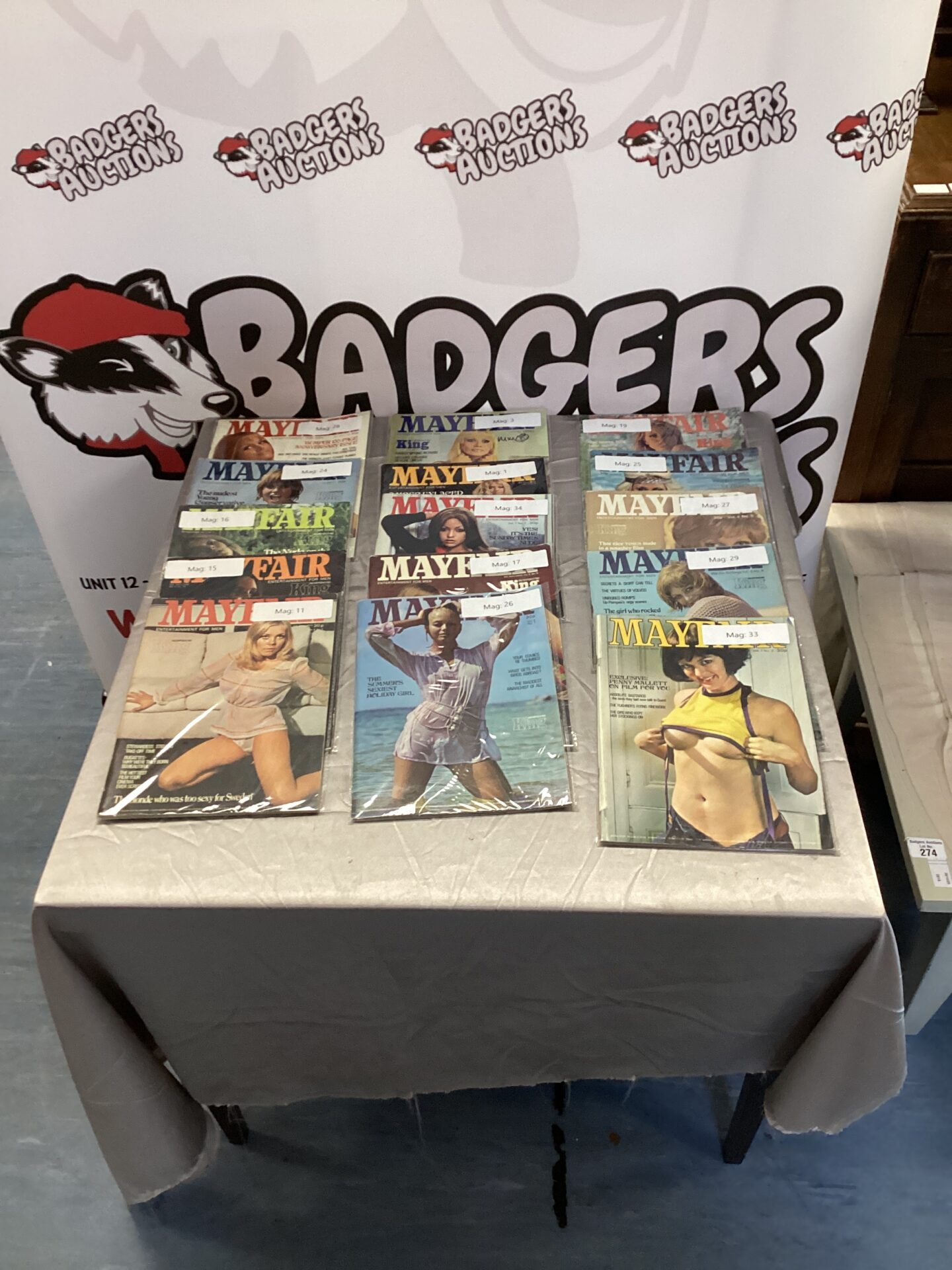 This lot comprises a collection of Mayfair magazines, adult publications popular in their time. These magazines showcase the aesthetic and cultural trends of the era, offering a glimpse into a specific period of publishing history. The collection represents a variety of covers and content, appealing to collectors interested in vintage adult magazines.