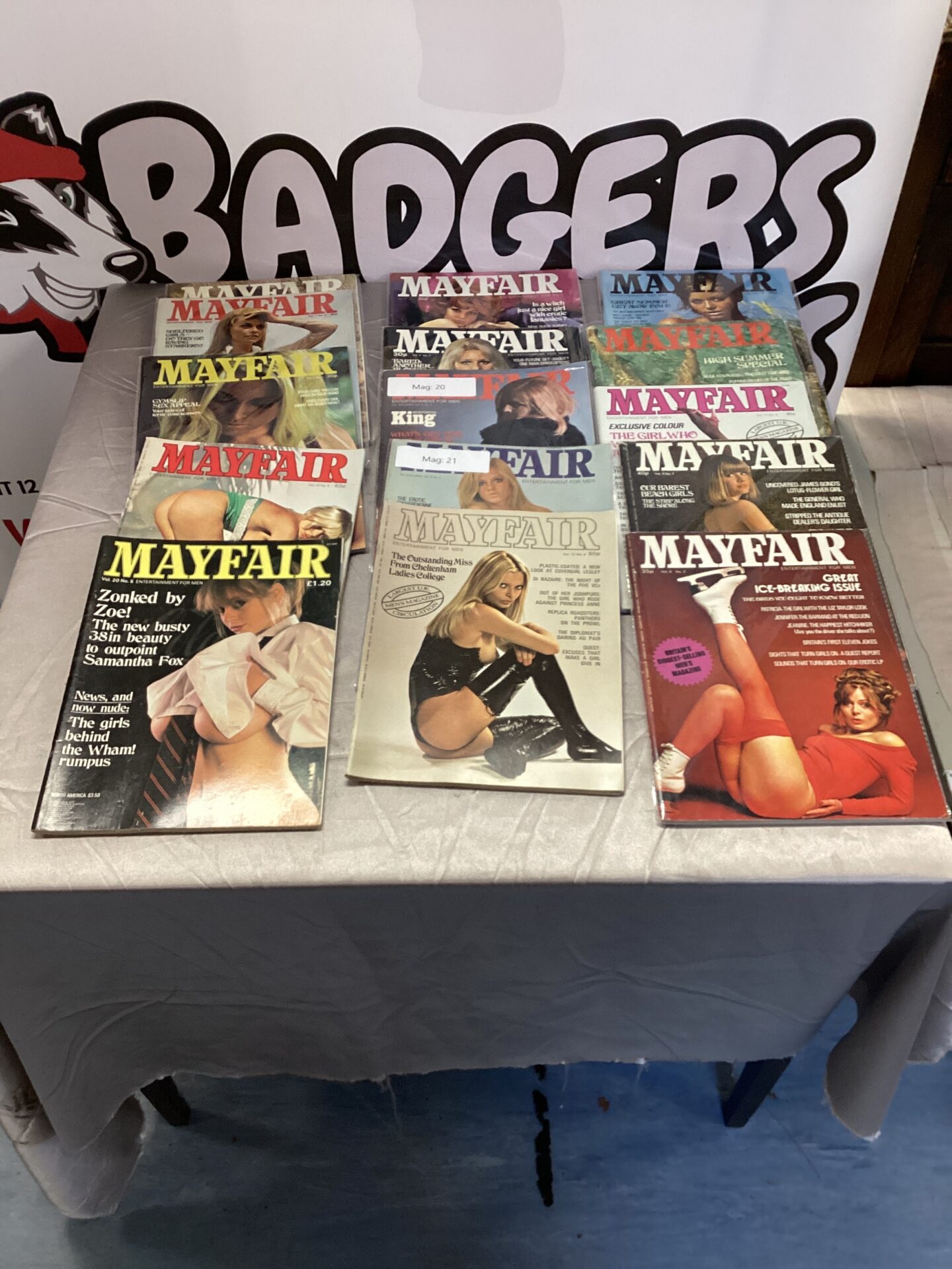 This lot comprises a collection of Mayfair magazines, catering to adult interests. These publications are known for their glossy presentation and feature photography. The magazines represent a snapshot of the era in which they were published, offering a glimpse into the cultural landscape of the time.