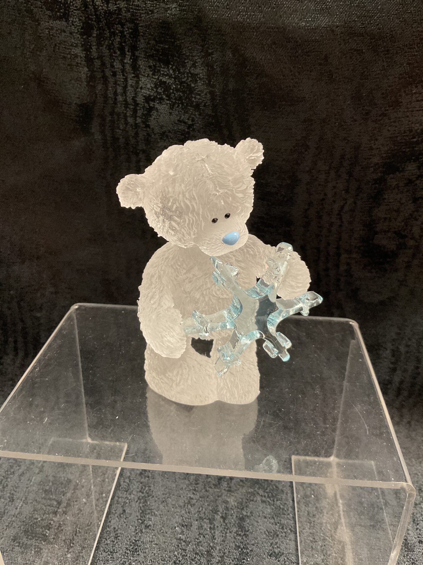 This beautiful crystal glass “Me To You” bear is a delightful collectible figurine. Featuring a delicate snowflake design and a pale blue ribbon, this bear adds a touch of whimsy to any collection. Perfect for display or as a thoughtful gift for a “Me To You” enthusiast.