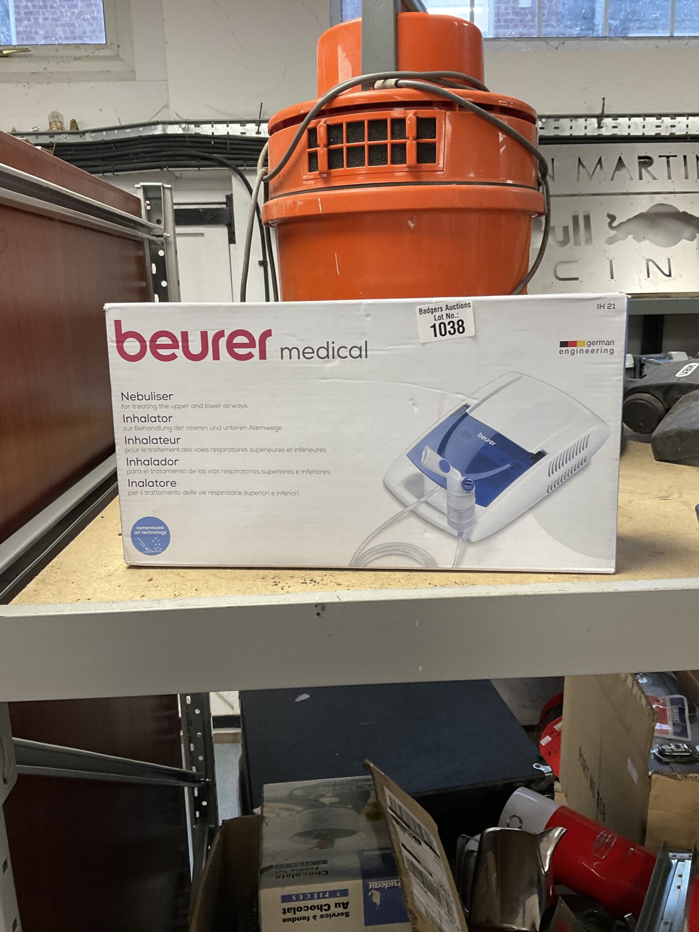 This is a Beurer medical nebuliser, model IH 21. Designed for respiratory therapy, this device is intended to administer medication in aerosol form. The nebuliser appears to be constructed from durable plastic and features a compact design, suitable for home use.
