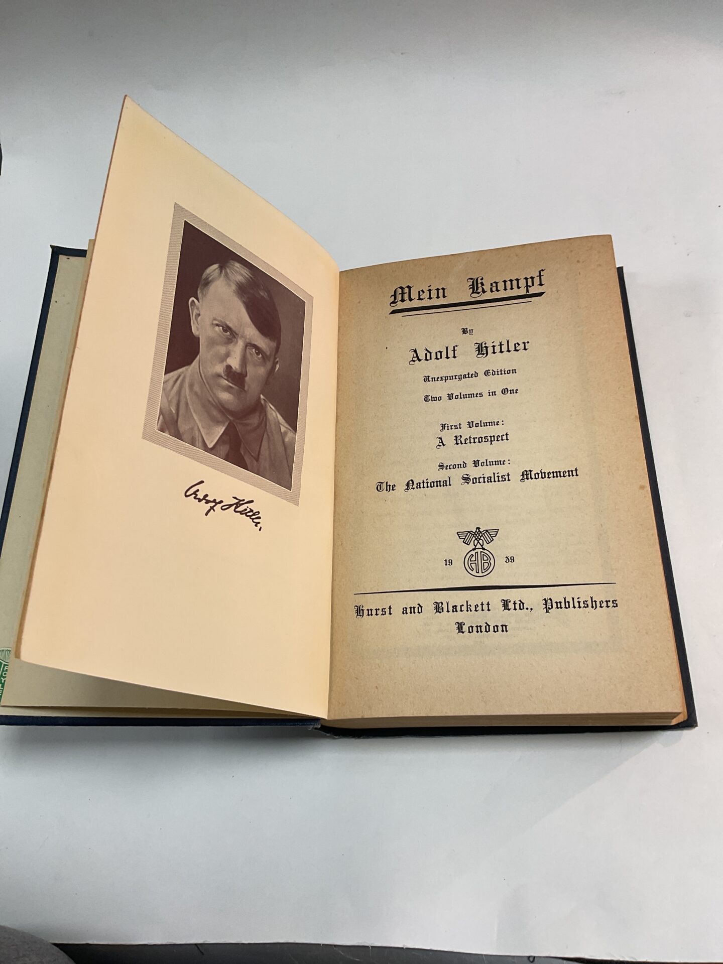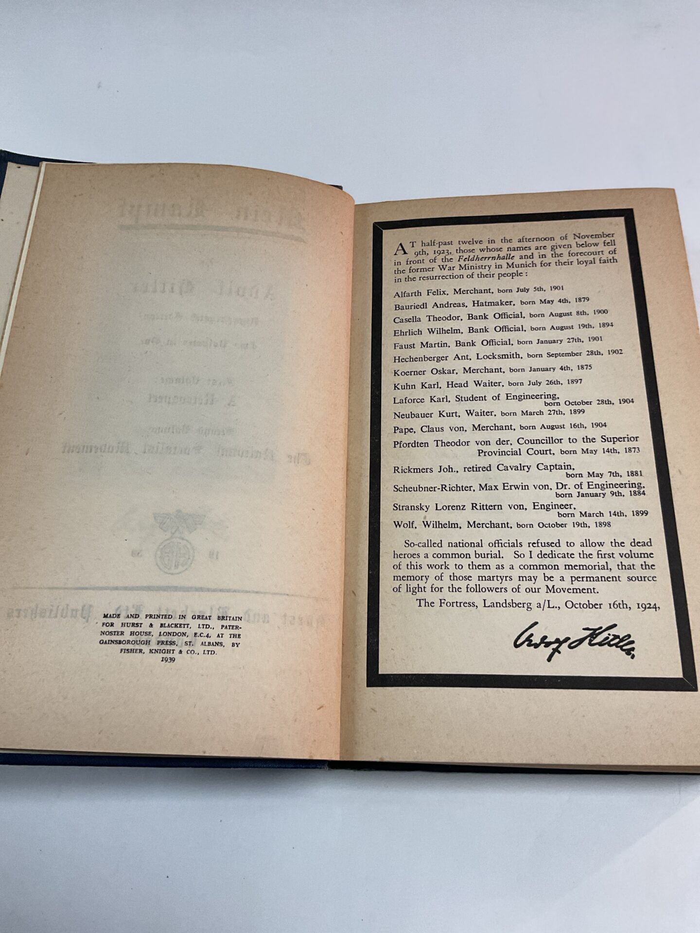 This is a 1939 English edition of Adolf Hitler’s *Mein Kampf*, published by Hurst and Blackett. This combined volume features a frontispiece portrait of Hitler and a list of names with dates. A controversial piece of political history, this book is of interest to collectors and those studying 20th-century history.