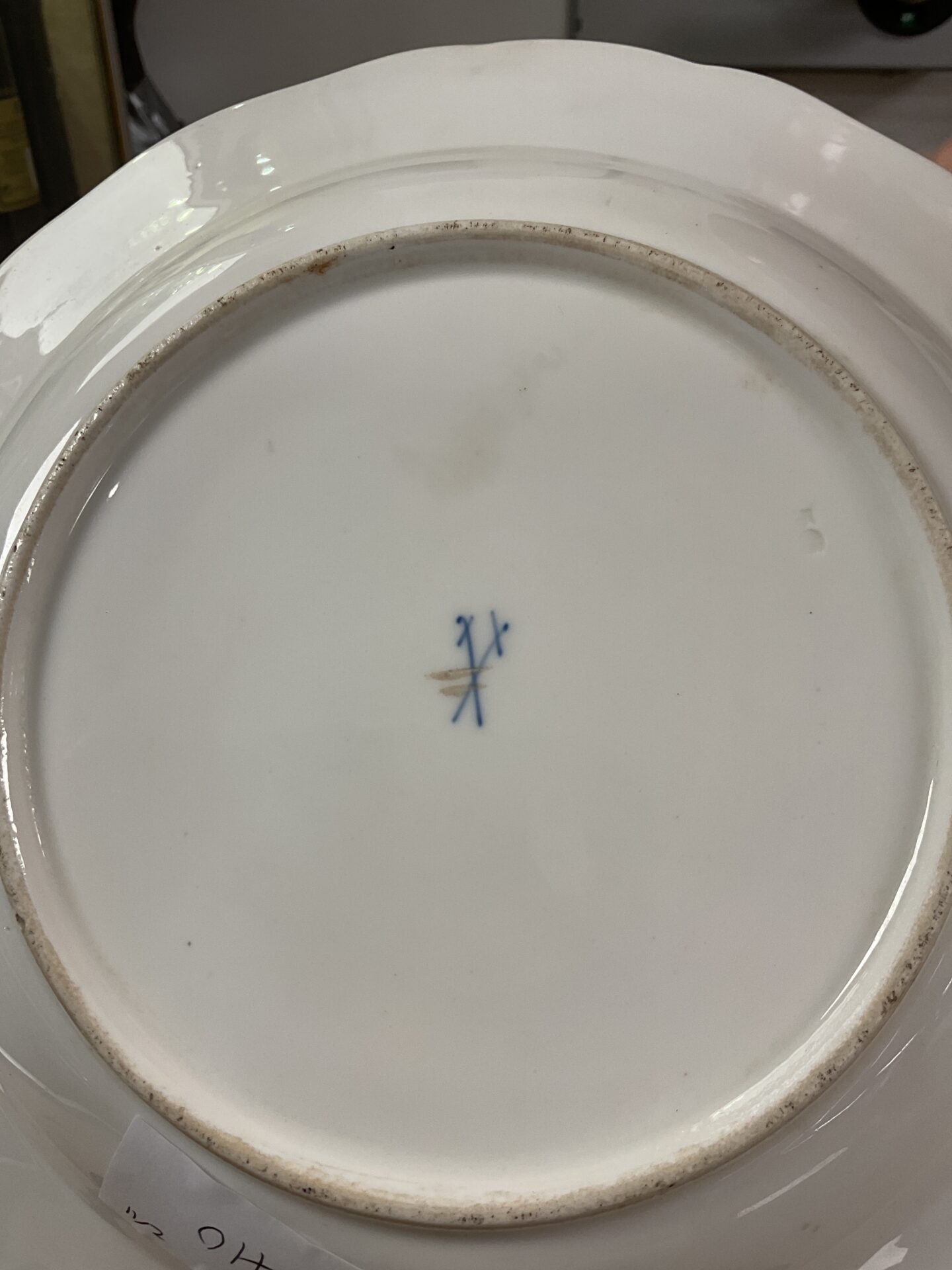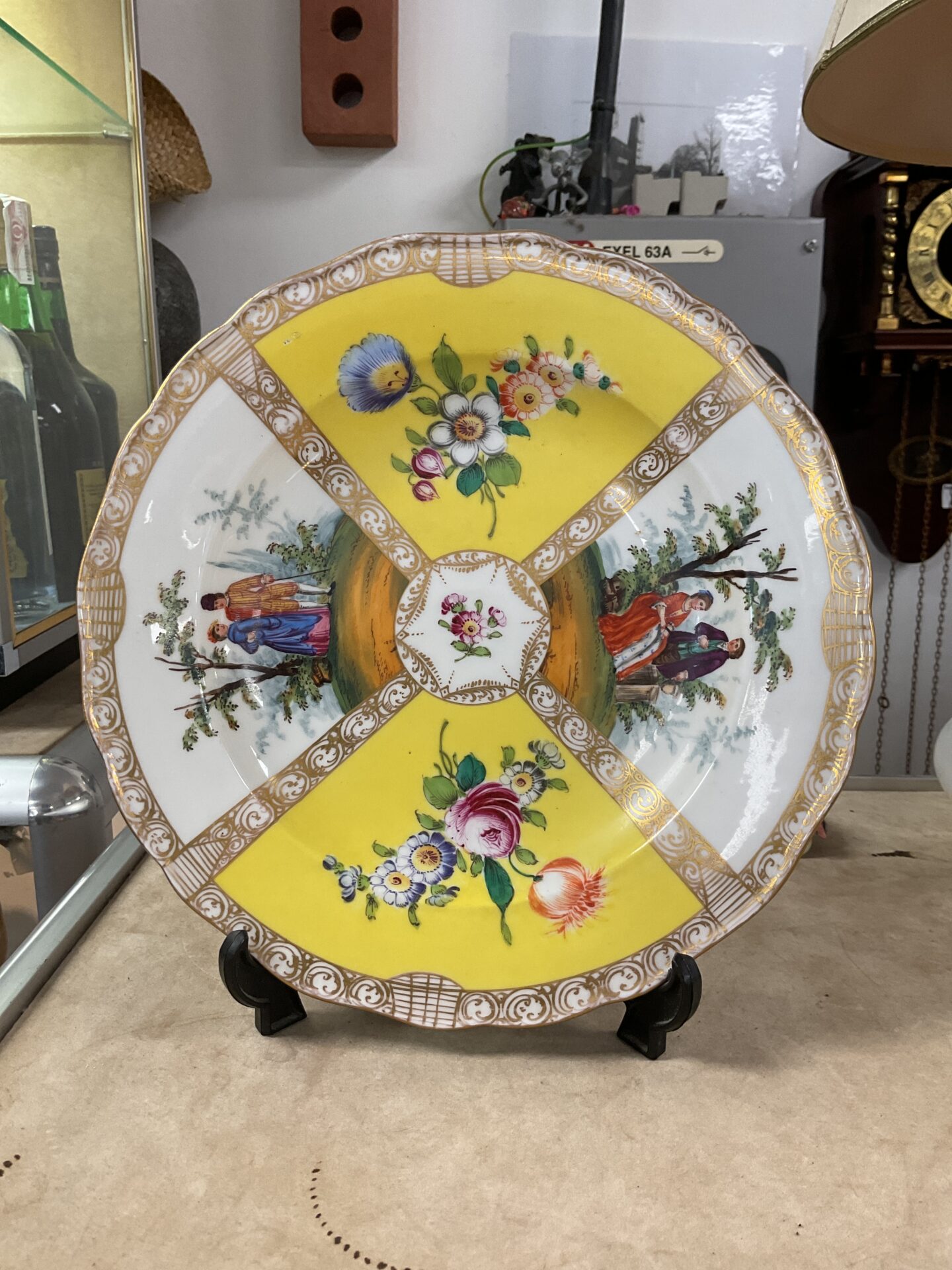 This exquisite plate is a fine example of Meissen porcelain craftsmanship. The plate features a vibrant yellow ground with a delicately painted floral design, interspersed with scenes of figures in landscape settings. The gilded rim and intricate detailing showcase the high level of artistry associated with Meissen porcelain, renowned for its quality and beauty.