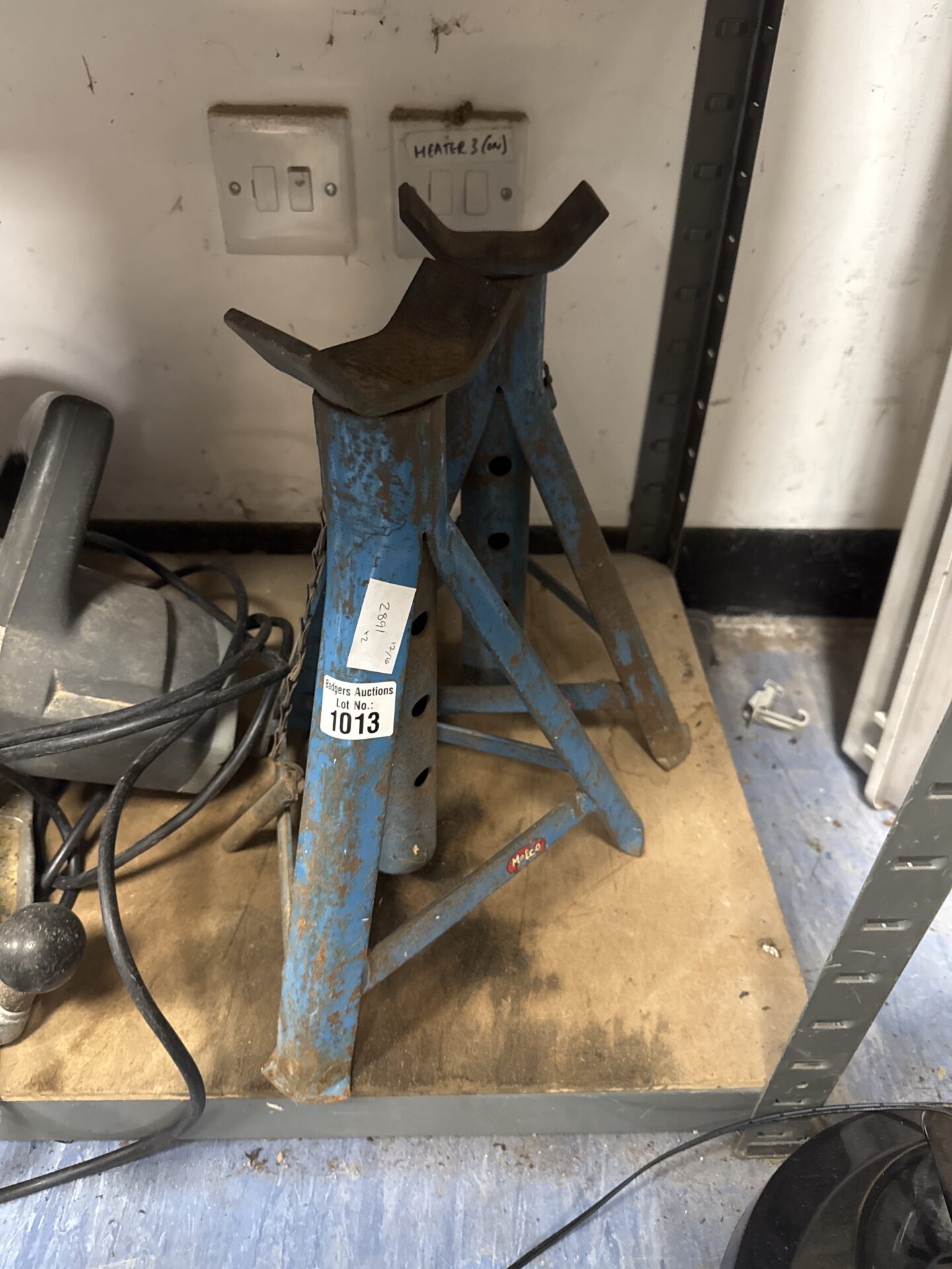This lot comprises a pair of Melco axle stands, essential tools for safely supporting vehicles during maintenance and repair work. These stands feature a robust steel construction, designed to provide stability and durability. Their height adjustability allows for use with a variety of vehicle types, making them a versatile addition to any garage or workshop.