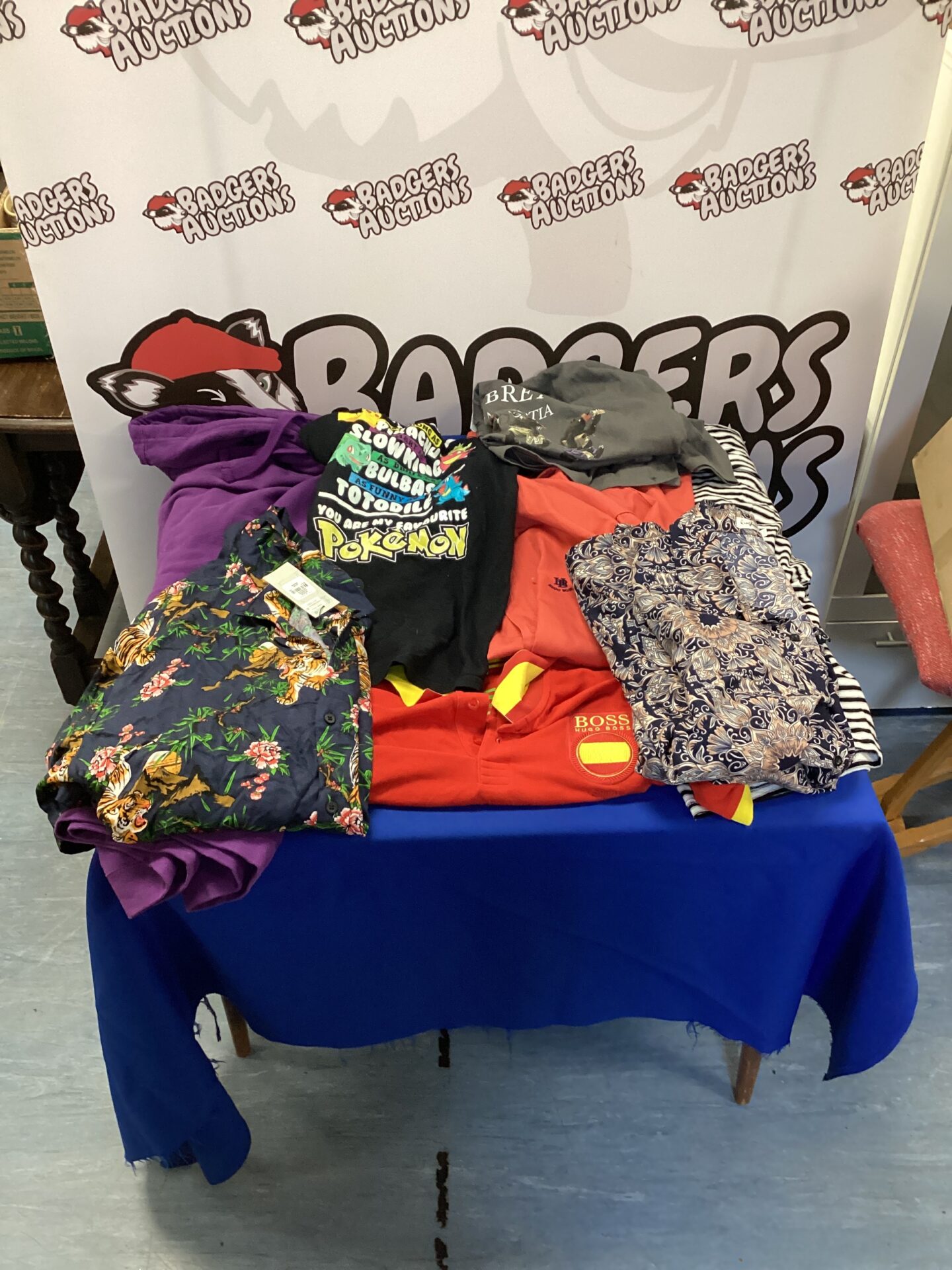 This lot comprises a selection of men’s clothing items, including pieces in the style of Hugo Boss and a Pokemon themed T-shirt. The bundle offers a variety of casual wear, potentially including shirts, trousers, and other garments. This collection provides a diverse range of styles for everyday wear or to expand a wardrobe.