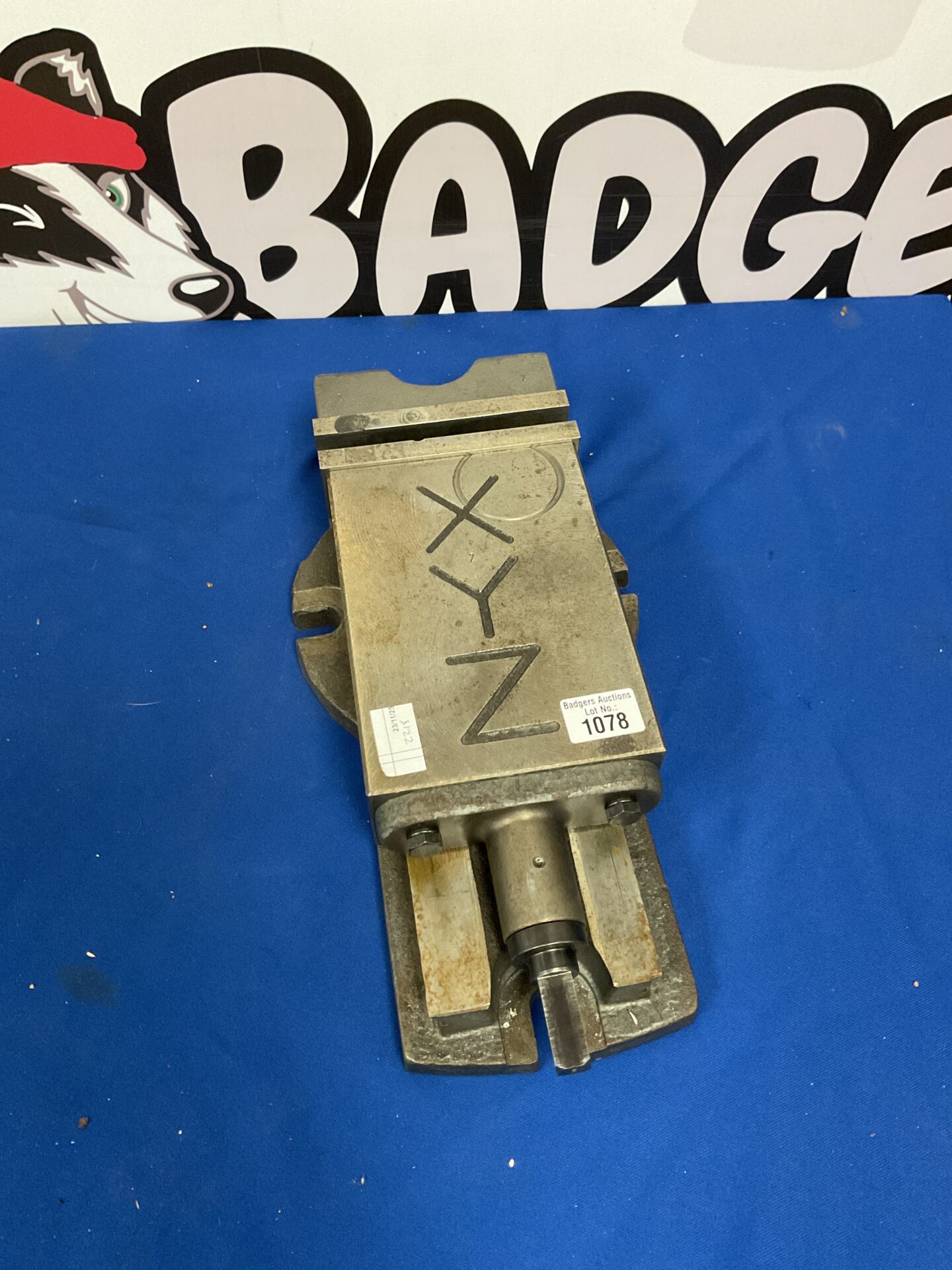 This is a substantial metal bench clamp, likely designed for heavy-duty workshop use. The clamp features a robust construction, suggesting it was built for securing materials during metalworking, woodworking, or other fabrication processes. Its design incorporates a screw mechanism for tightening and a solid base for stability when mounted to a workbench.