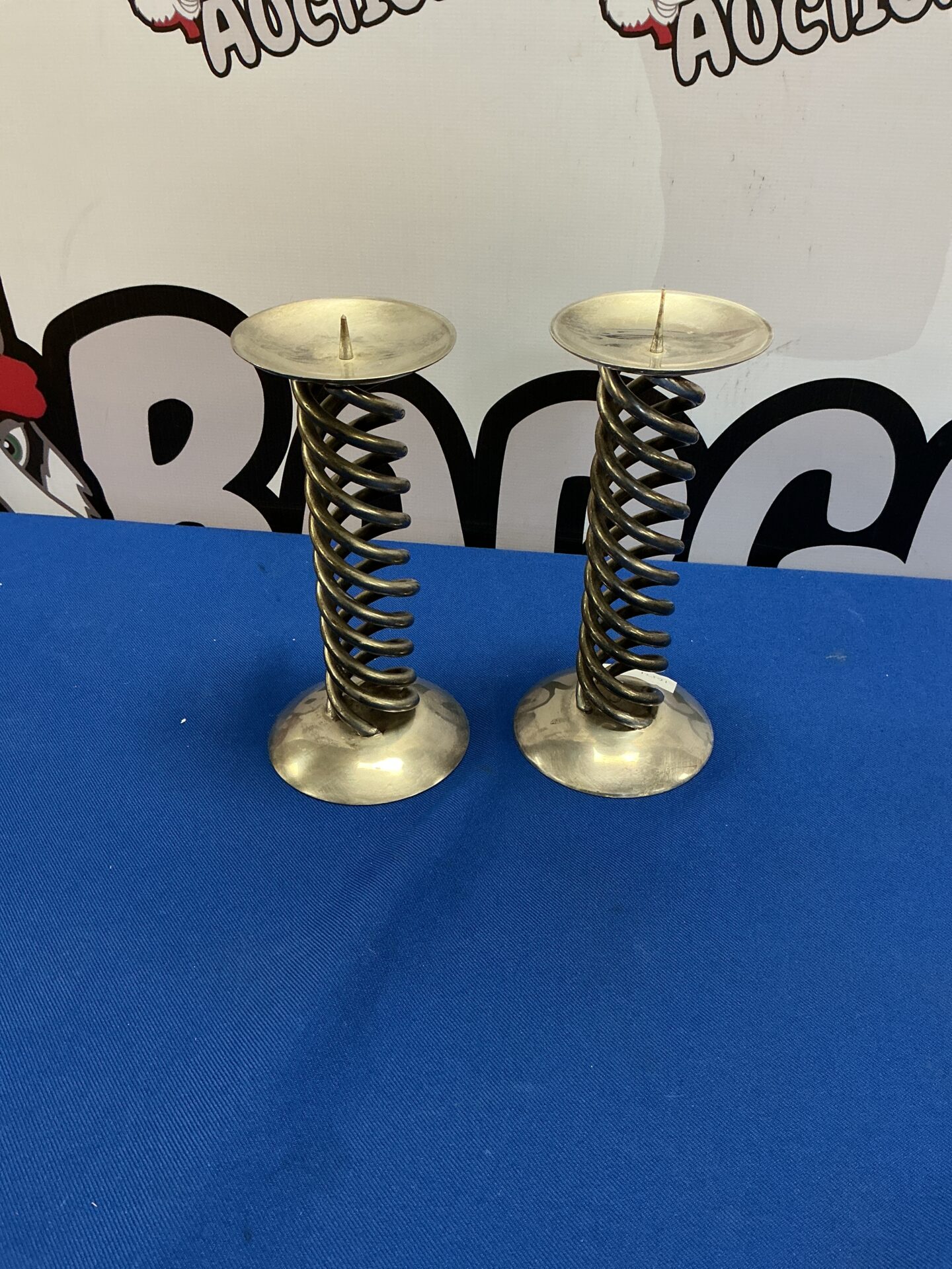 These are two metal candle holders featuring a unique coil design. Crafted from a metallic material, they exhibit a vintage aesthetic, likely intended for use as table centerpieces or decorative accents. The coiled base provides a stable foundation for the candle platform, adding a touch of artistic flair to any setting.