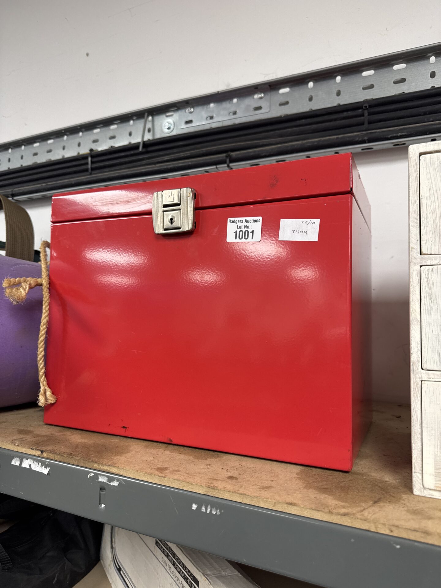 This is a metal filing box, designed for document storage and security. Constructed from metal, it features a locking mechanism for safeguarding contents. The box is a practical solution for organizing papers, files, and other important documents, offering a durable and secure storage option for home or office use.
