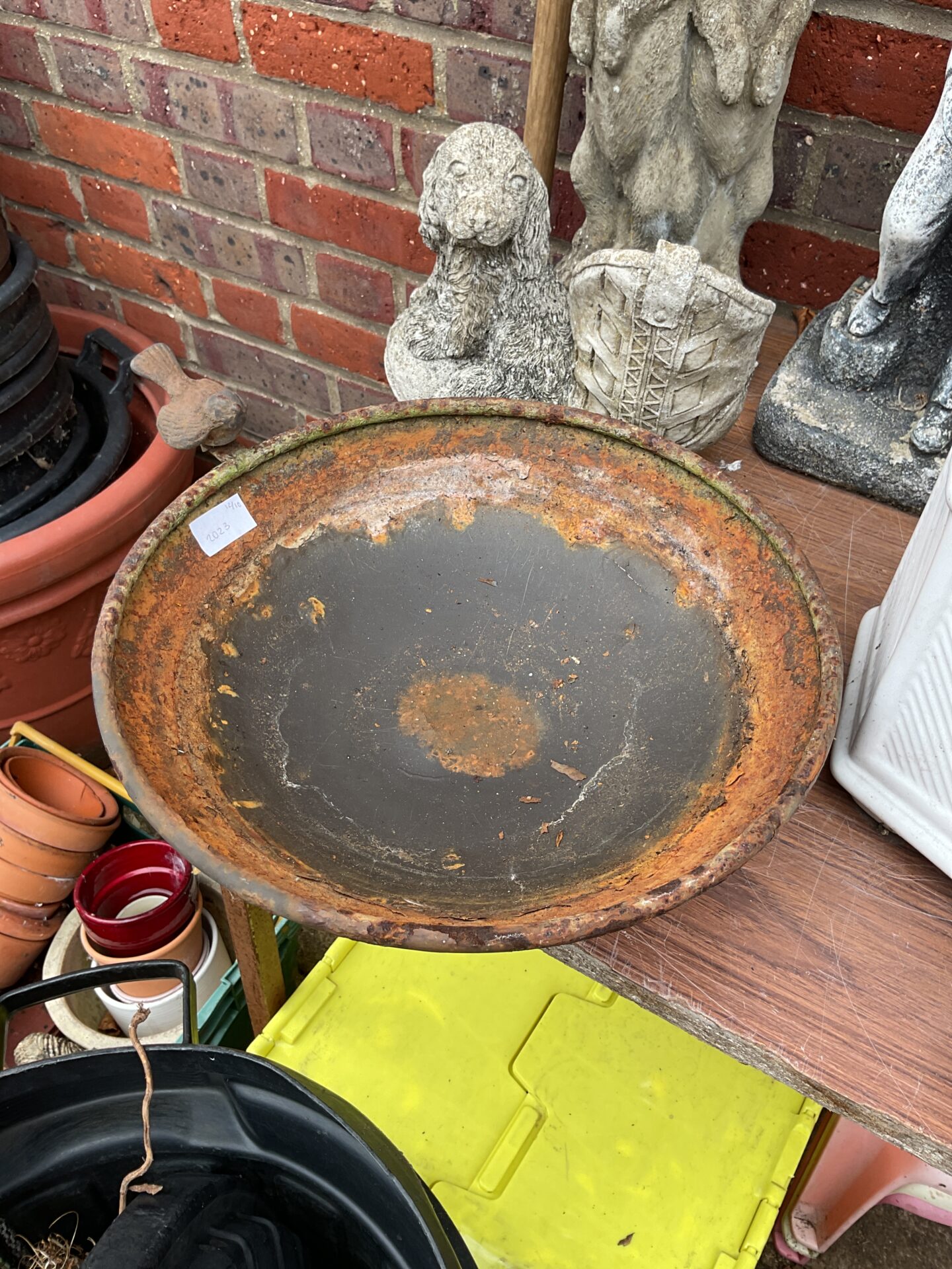 The bird bath shows signs of weathering and patina, consistent with its age and outdoor use. This adds to its character and vintage appeal. It is structurally sound and ready for immediate use. Collectors and garden enthusiasts will appreciate its rustic aesthetic and the opportunity to add a unique and functional piece to their outdoor collection.