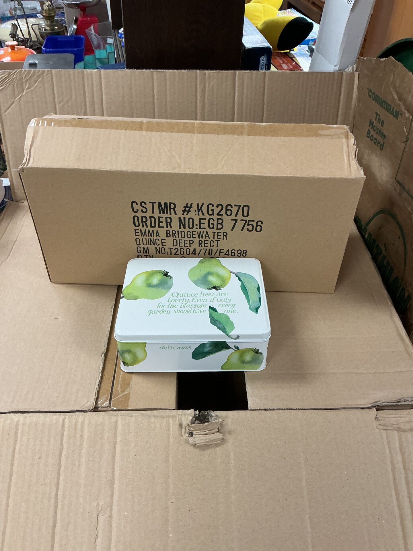 This lot comprises a quantity of new metal tins, featuring the Emma Bridgewater ‘Quince’ design in a ‘Deep Rect’ format. The tins are decorated with a charming illustration of quinces and foliage, and the box indicates order number EGB 7756 and customer number KG2670. These tins would be ideal for storage or as collectible items for fans of the Emma Bridgewater brand.