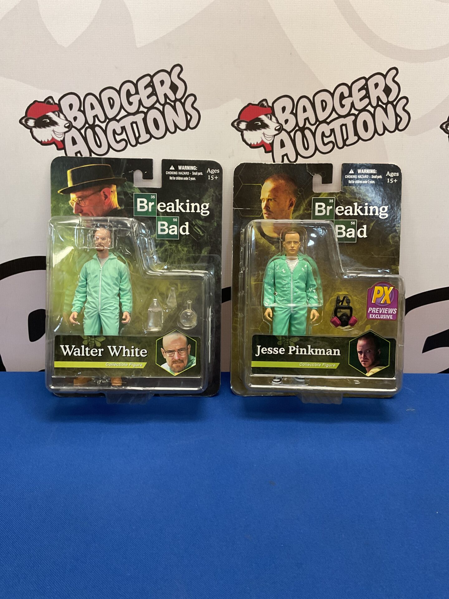 These figures appear to be in original packaging, and are intended for display by collectors. The packaging shows some wear, consistent with age and handling. These figures would be a valuable addition to any Breaking Bad or Mezco collectibles collection, appealing to fans of the show and collectors of high-quality action figures.
