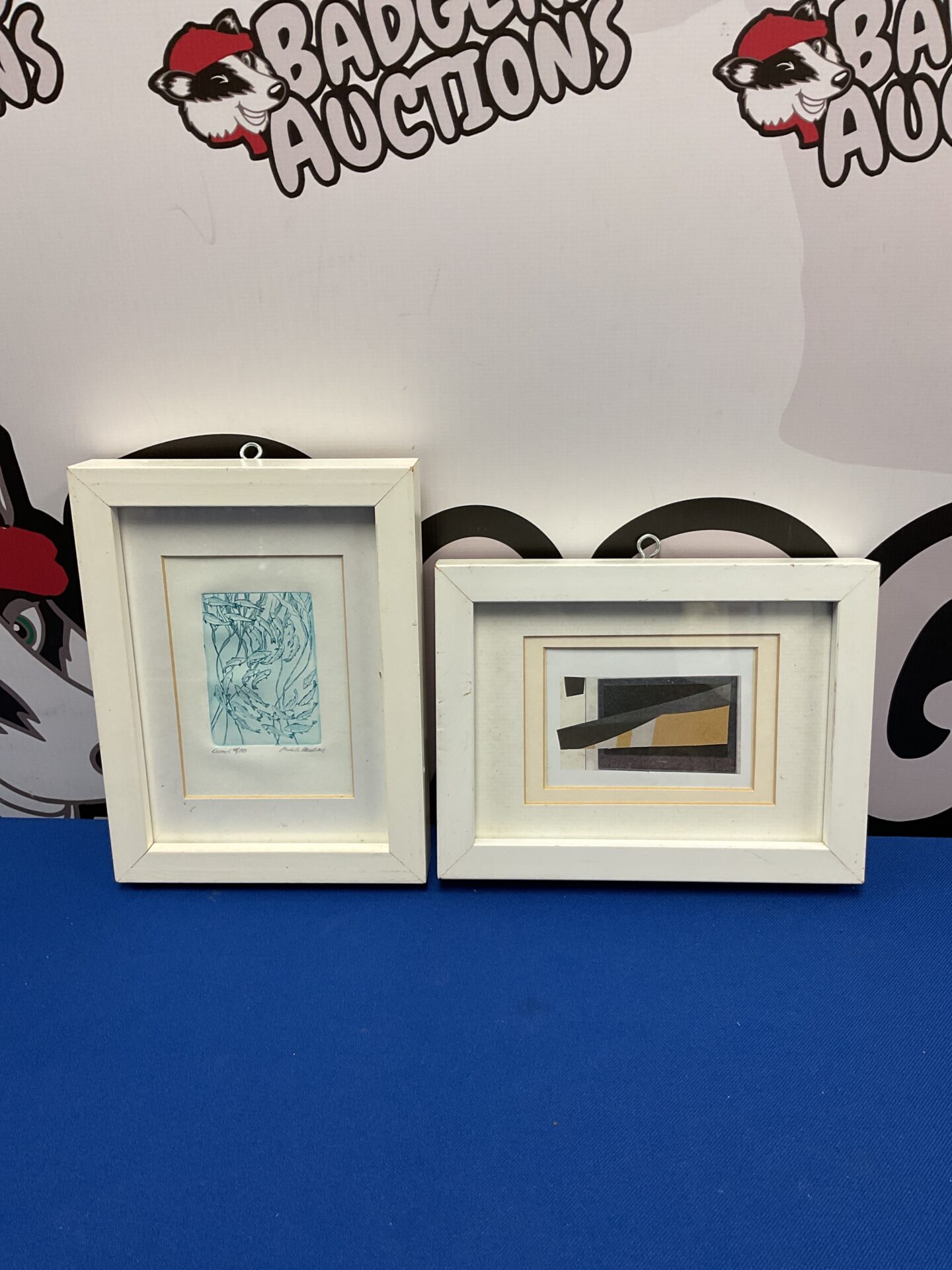 Both artworks appear in good condition, with no immediately apparent damage or significant flaws. The frames show minor wear consistent with age and handling. These pieces would be of interest to collectors of original prints, abstract art, or those seeking unique and affordable artwork to enhance their home decor. The combination of established and emerging artists adds to their potential value.
