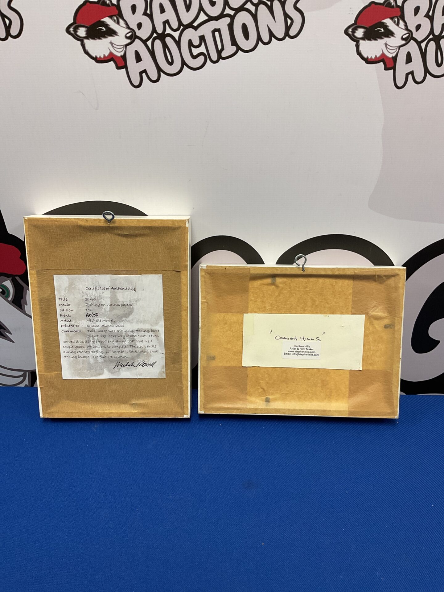 This lot comprises two original art studies, one an etching by Michelle Morrell depicting a detailed scene of trees and foliage, and the other an abstract composition by Stephen Hills titled “Cornish Hills”. Both pieces are presented within simple white frames, enhancing their visual appeal and providing a ready-to-display format. The contrasting styles offer a diverse aesthetic, appealing to a range of art preferences.