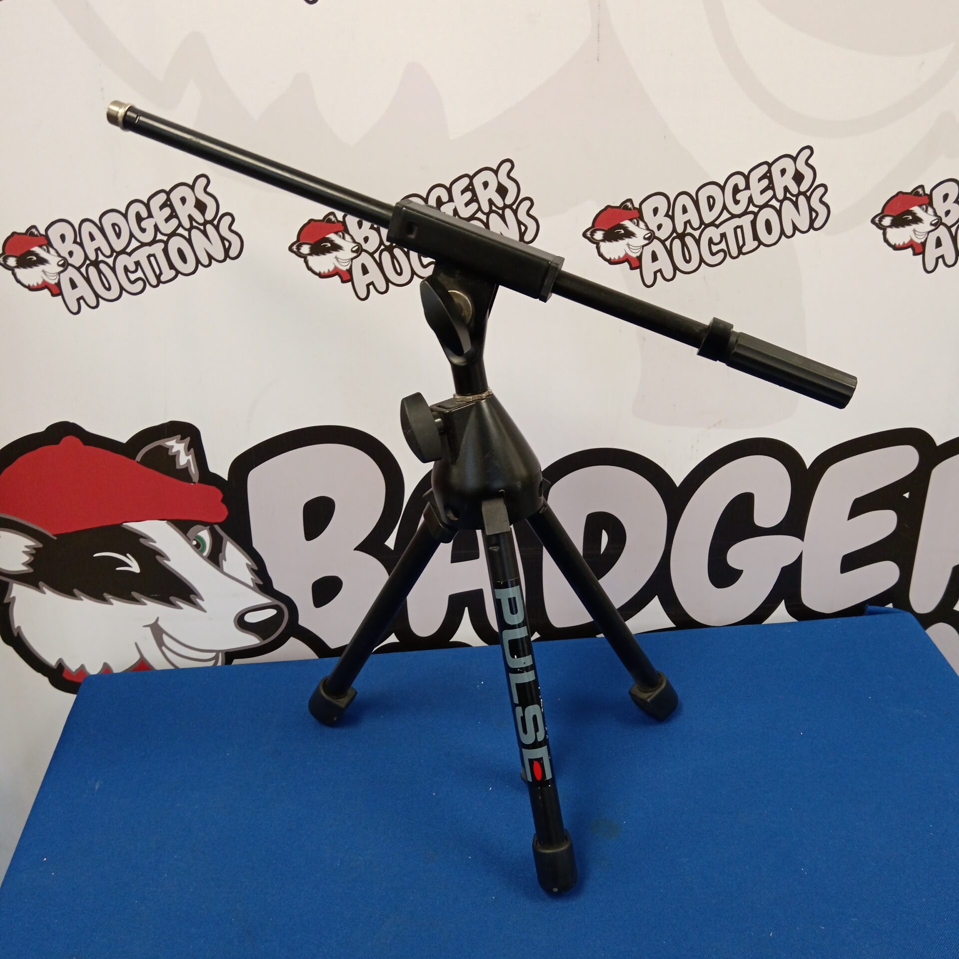 This is a Pulse microphone stand, designed for vocal or instrument recording and performance. It features a tripod base for stability and a boom arm for flexible positioning. The stand is adjustable in height, allowing for optimal microphone placement for various applications.