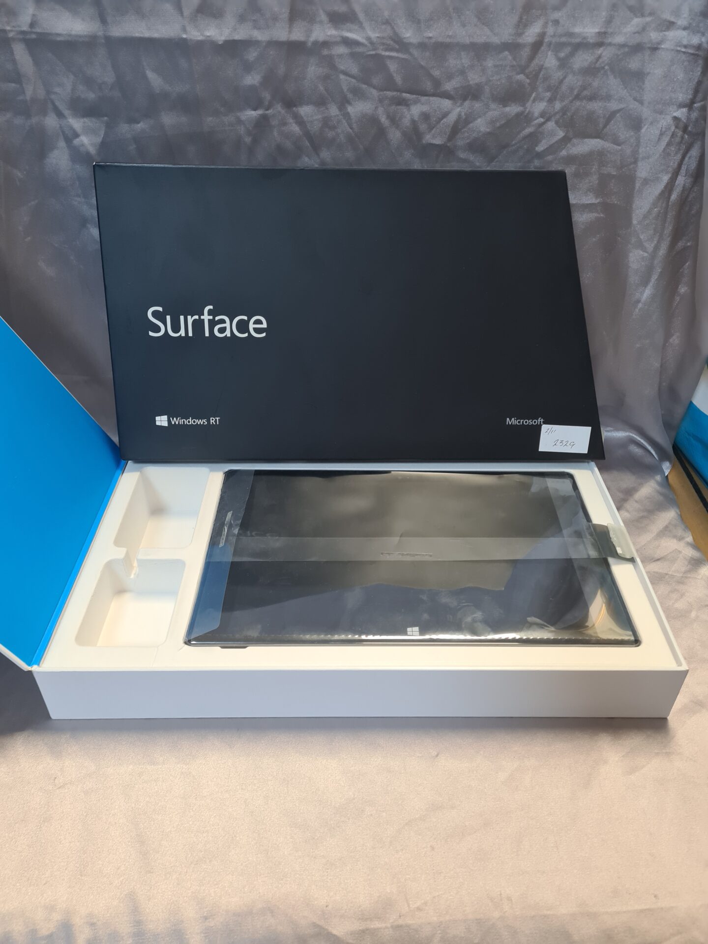 This boxed Microsoft Surface RT tablet represents an early foray by Microsoft into the tablet market. Released in 2012, the Surface RT features a 10.6-inch touchscreen display and runs on the Windows RT operating system. This particular example includes the original packaging, offering a glimpse into the product’s initial presentation and marketing.