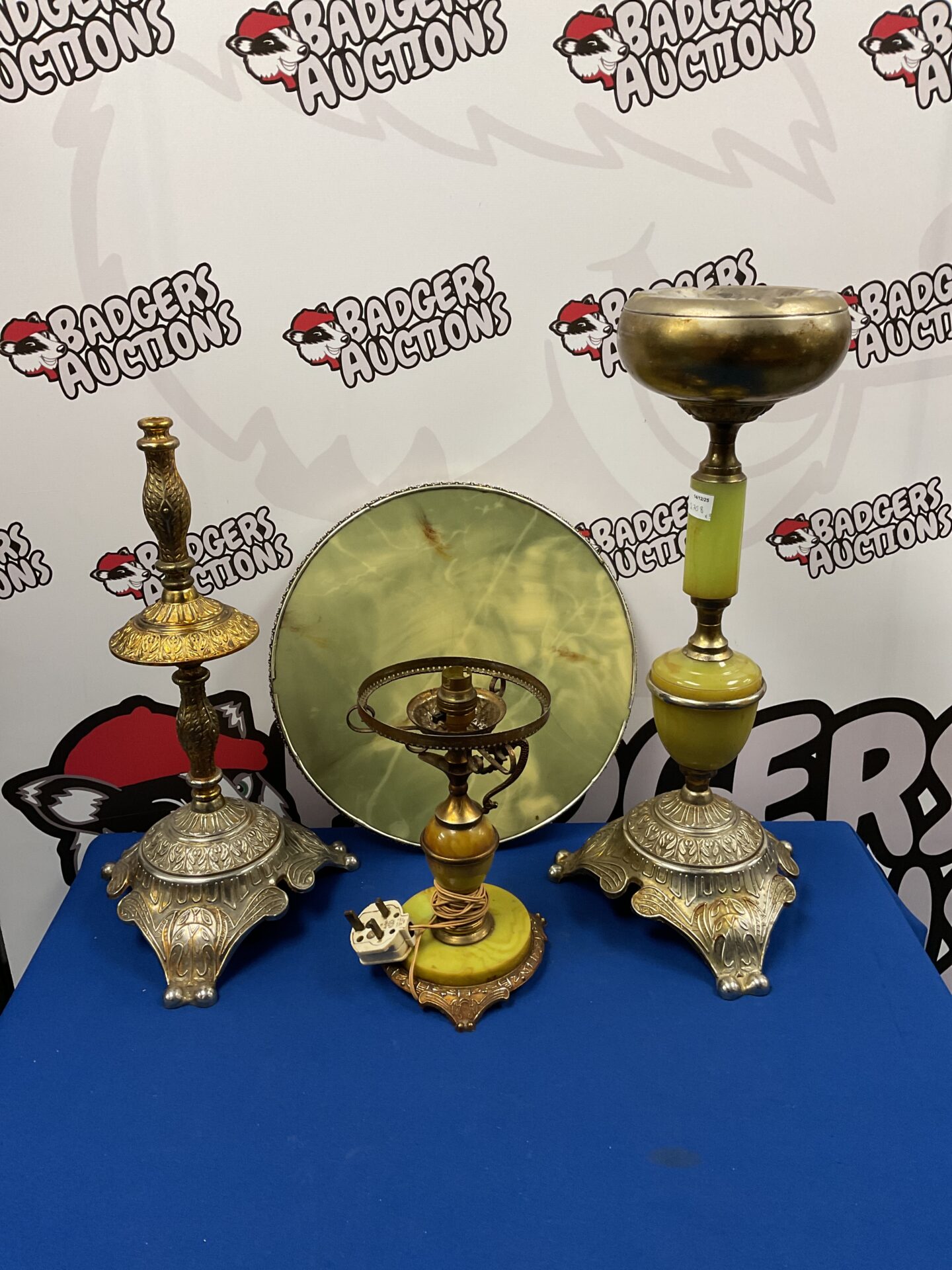 This striking set comprises a pedestal ashtray, a coordinating table, and a table lamp, all exhibiting the hallmarks of mid-century modern design. The pieces feature a gilded finish, likely brass or a brass alloy, and a distinctive atomic age aesthetic. The ashtray is elevated on a slender pedestal base, while the table and lamp share a similar design language, creating a cohesive and stylish ensemble.