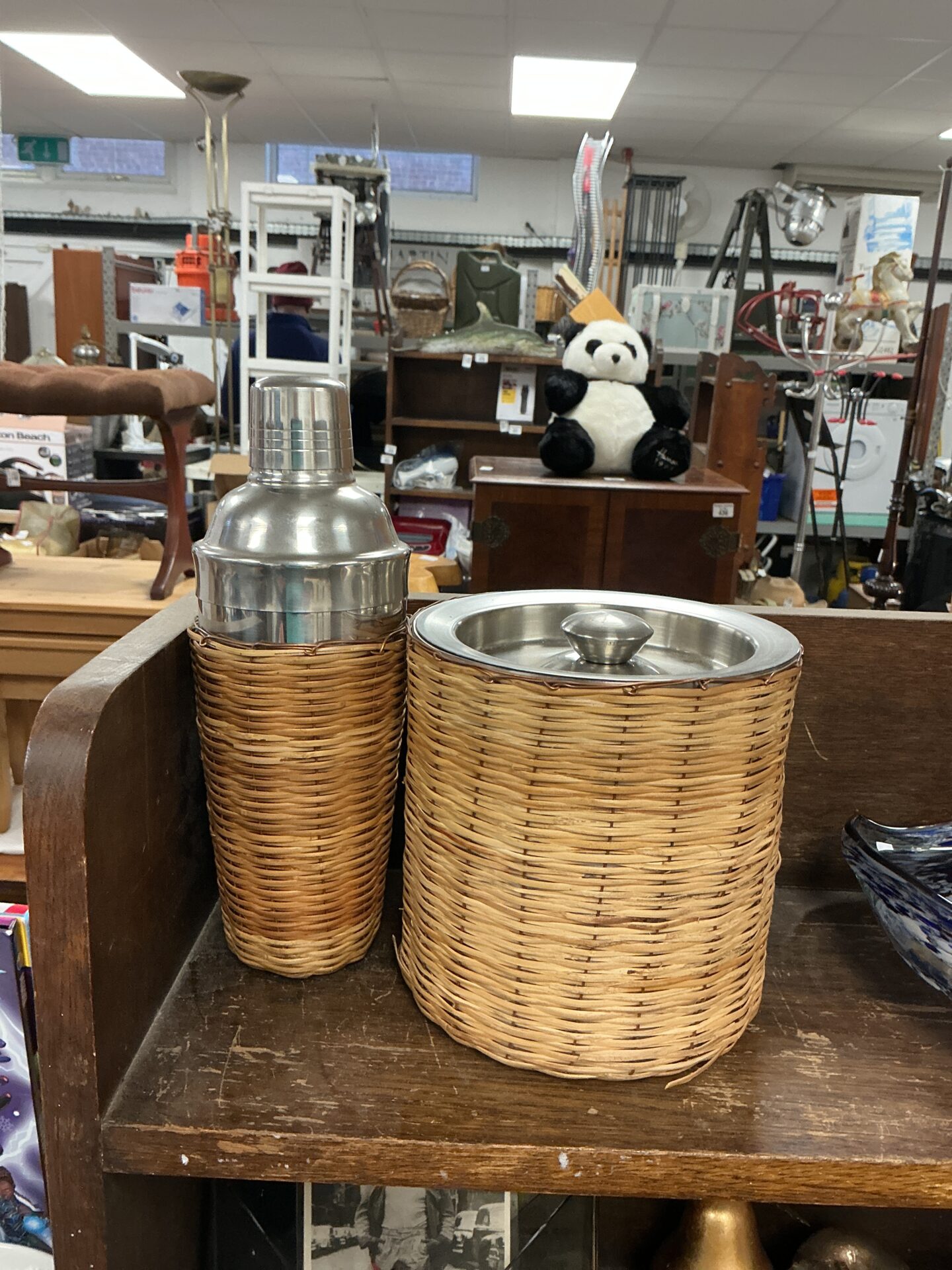 This charming cocktail set features a shaker and ice bucket, both crafted with woven natural fibres, likely rattan or wicker, over a metal inner. The set embodies the clean lines and organic materials characteristic of mid-century Scandinavian design. The shaker has a screw-top lid, and the ice bucket is designed to hold a generous amount of ice, making it perfect for entertaining guests in style.