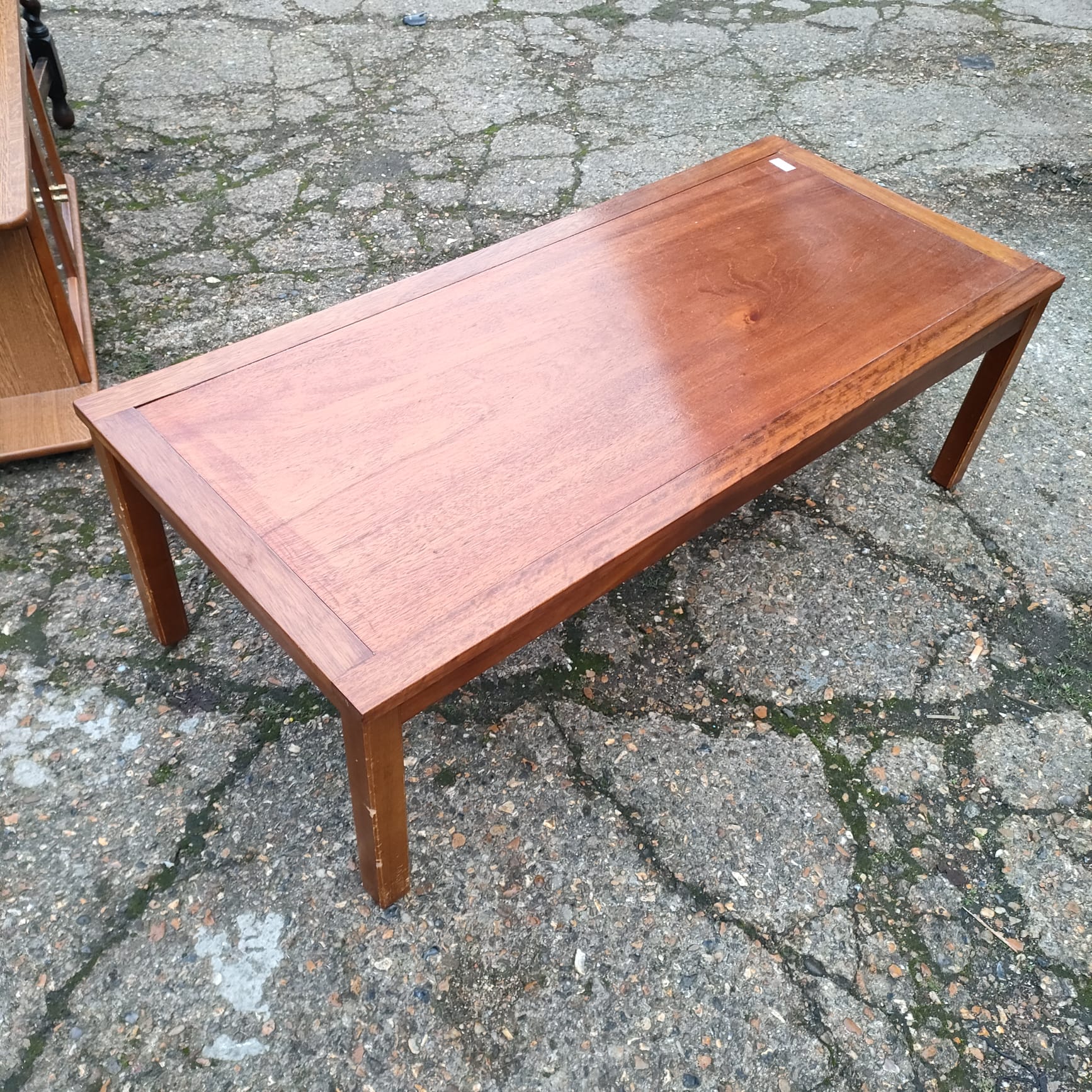 This coffee table exemplifies mid-century modern design, likely originating from the 1960s. Constructed from solid wood, it features clean lines and a warm, inviting aesthetic. The table’s simple, elegant form and functional design make it a versatile addition to any living space, blending seamlessly with a variety of interior styles. Its rectangular shape and raised edges provide ample surface area for display or everyday use.