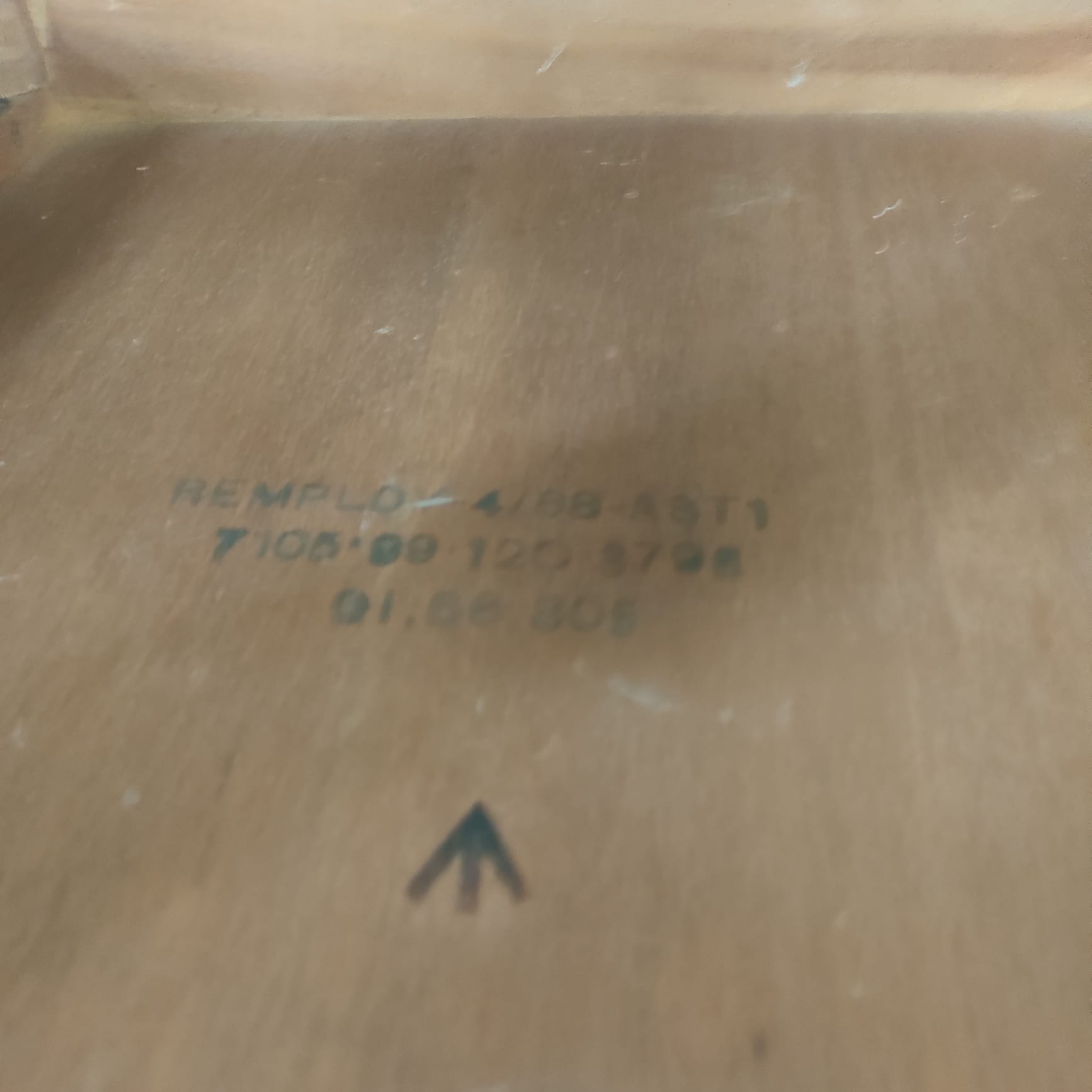 This is a mid-century modern coffee table, likely dating from the 1960s. The table features a rectangular teak veneer top with clean lines and tapered legs, typical of the era. It is marked with what appears to be a military stamp, suggesting it may have been used in a military setting or produced for military personnel. The simple, functional design and warm wood tone make it a versatile piece for a variety of interior styles.