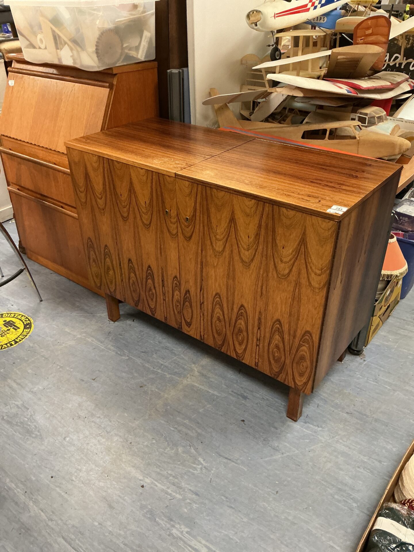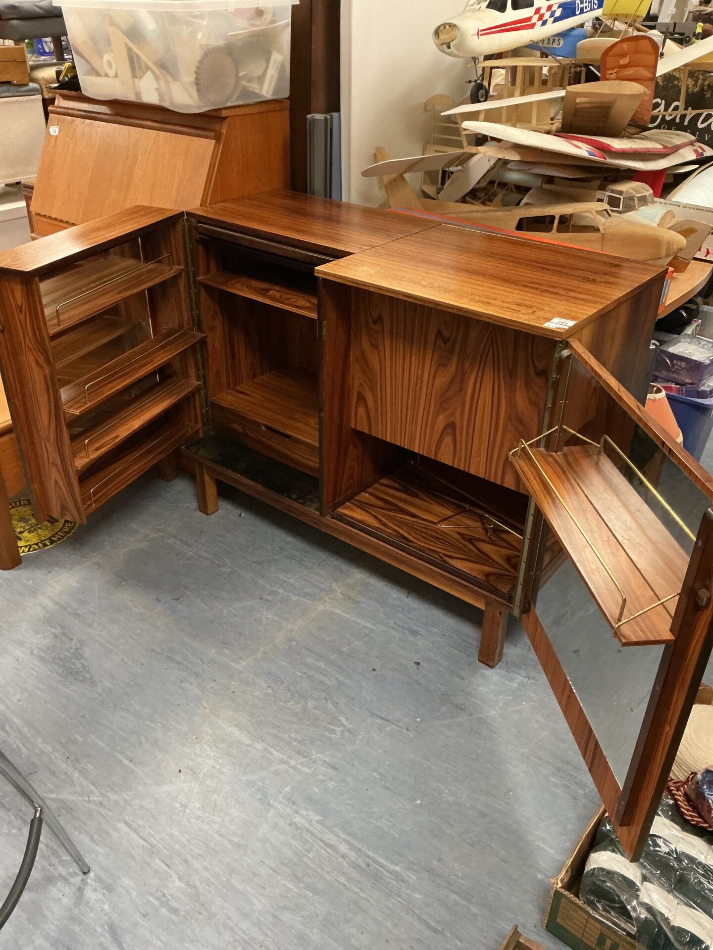 This striking mid-century modern cocktail cabinet, a “Selfie Systemer” model, showcases beautiful wood grain and a distinctive scalloped front design. Constructed from teak or a similar hardwood, this cabinet offers ample storage for barware and bottles. The interior likely features shelving and potentially a mirrored back, typical of cocktail cabinets from this era. Its sleek lines and warm tones exemplify the Scandinavian design aesthetic popular in the 1960s and 70s.