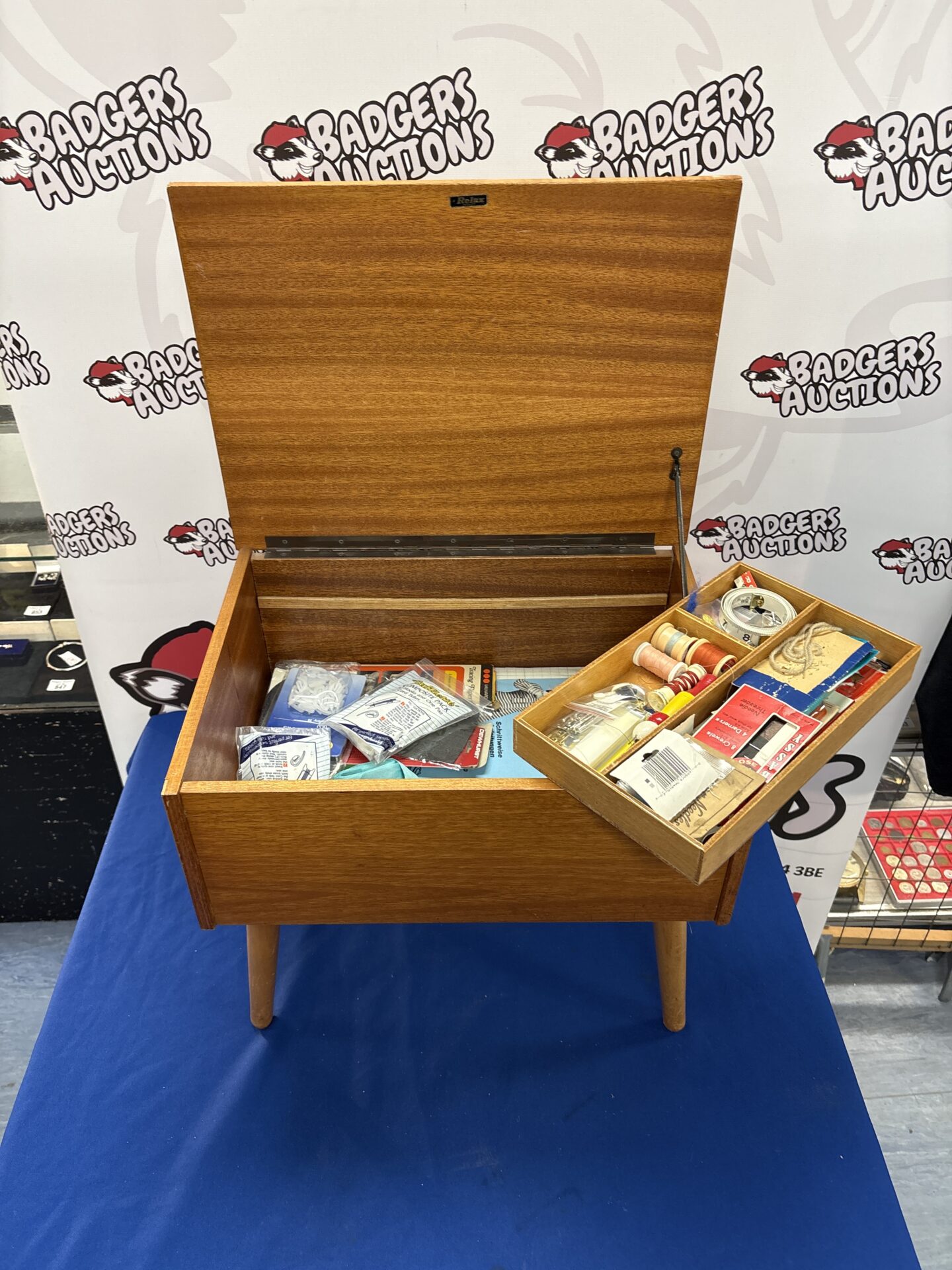 This mid century sewing box is constructed from oak, featuring a lift-top lid and tapered legs characteristic of the era. The interior offers a variety of compartments and spaces for storing sewing essentials. It presents a classic design, blending functionality with the aesthetic sensibilities of mid-century modern style.
