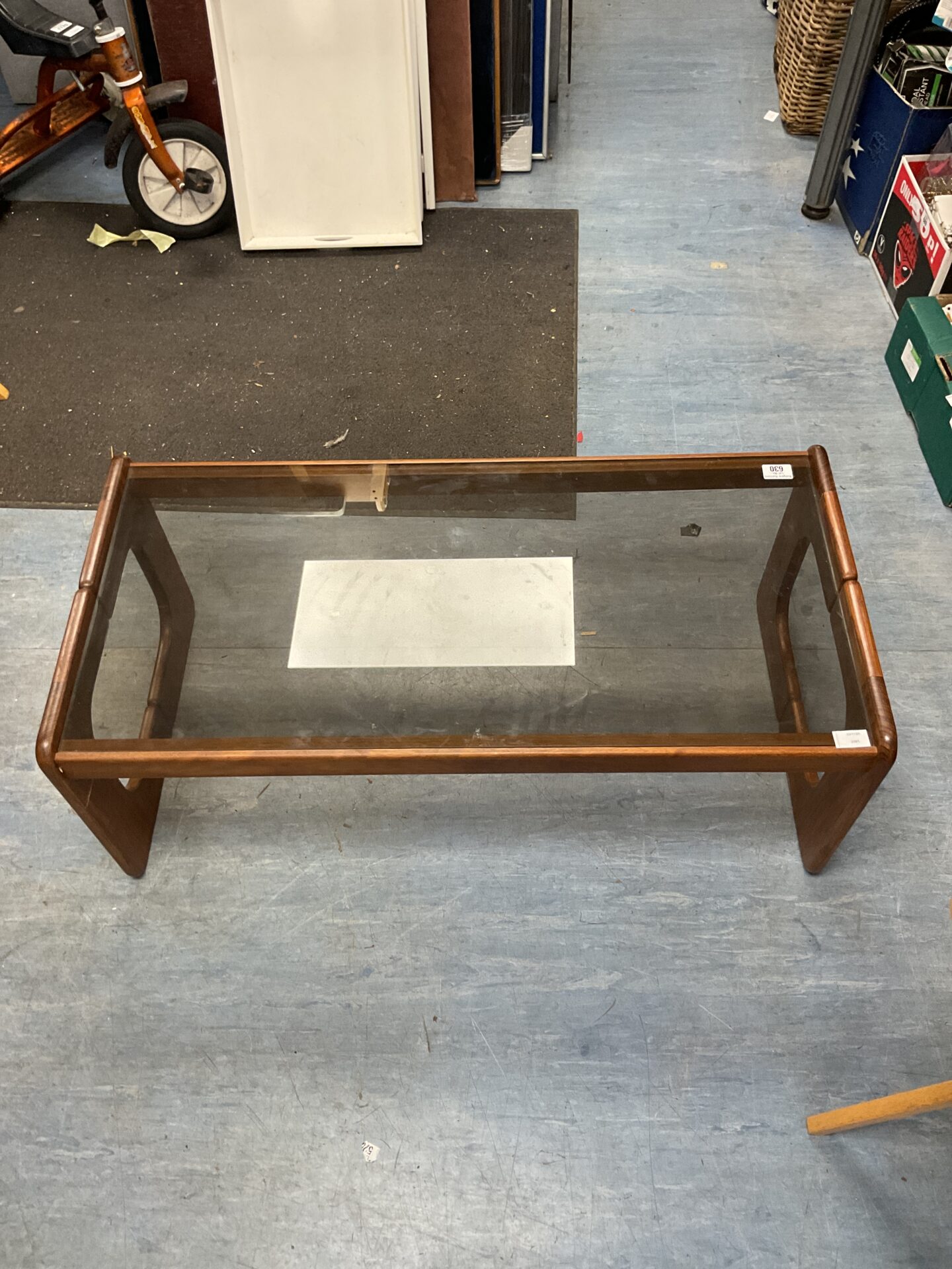 This table shows signs of wear consistent with age and use, which adds to its character. The teak wood may exhibit some patina and minor imperfections, while the glass top may have slight surface scratches. Despite these minor flaws, the table remains structurally sound and presents well, making it a desirable piece for collectors of mid-century furniture or those seeking a vintage aesthetic.