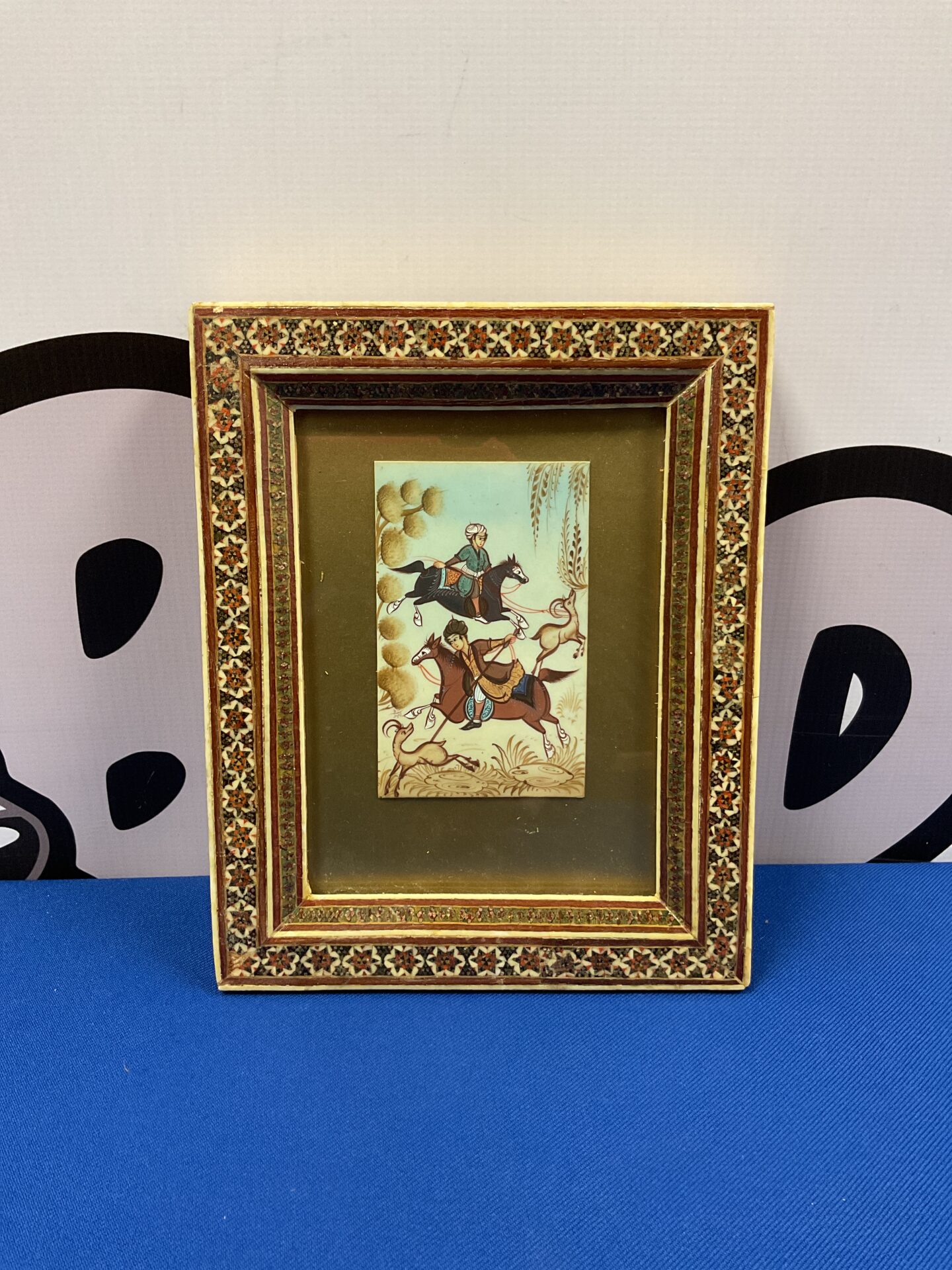 This is a delicate antique painting executed on a thin slice of bone, depicting a vibrant hunting scene typical of Middle Eastern artistry. The painting showcases a group of figures on horseback, engaged in a hunt, rendered in a traditional style with rich colours and intricate detail. The artwork likely originates from the Islamic world, possibly Persia or a related region, and reflects the cultural emphasis on horsemanship and the pursuit of game.