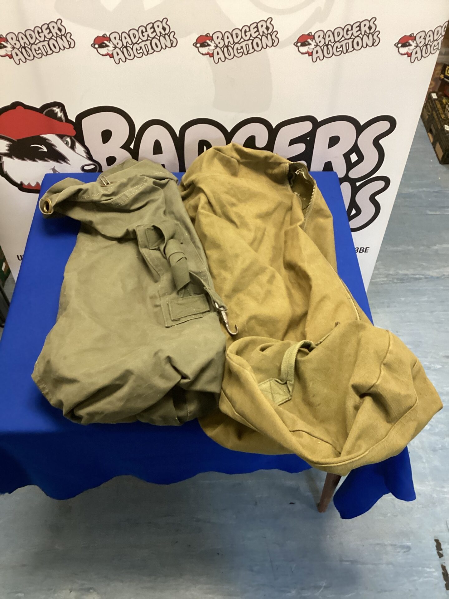 This lot includes two heavy-duty military kit bags crafted from durable canvas. Ideal for collectors, re-enactors, or practical use, these bags offer robust storage with a simple drawstring closure. Showing signs of wear consistent with surplus items, they are structurally sound and ready for use.