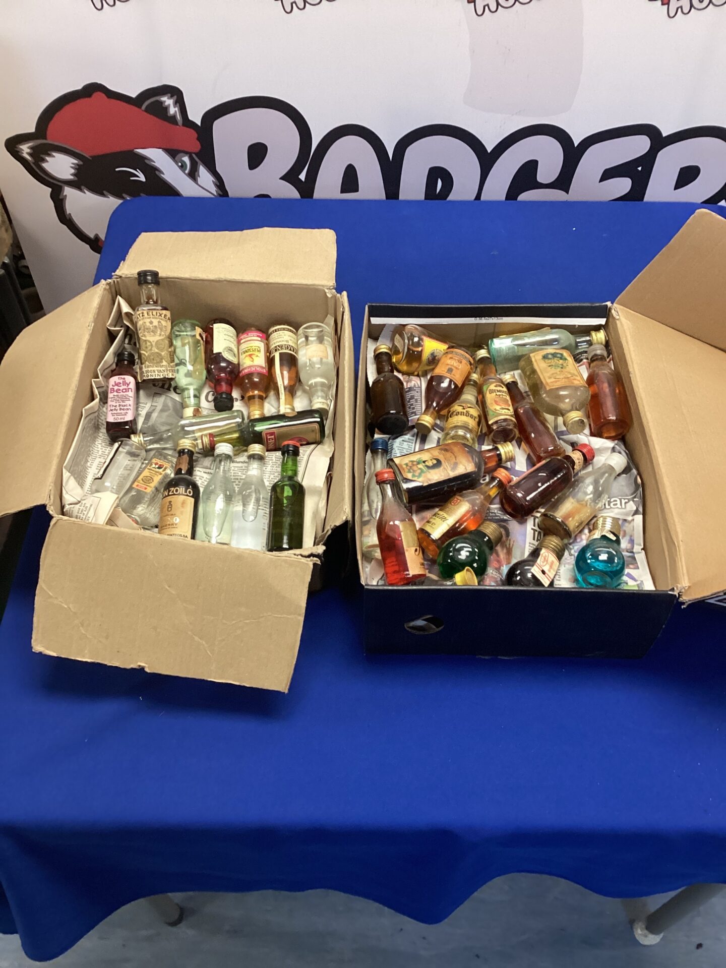 This lot comprises two boxes filled with a diverse collection of miniature alcohol bottles. The assortment includes brands like Catz Elixir and Negrita, alongside a variety of other liquors presented in small, collectible formats. These miniature bottles represent a fascinating glimpse into the history of branding and packaging within the spirits industry, and offer a unique display opportunity for collectors.