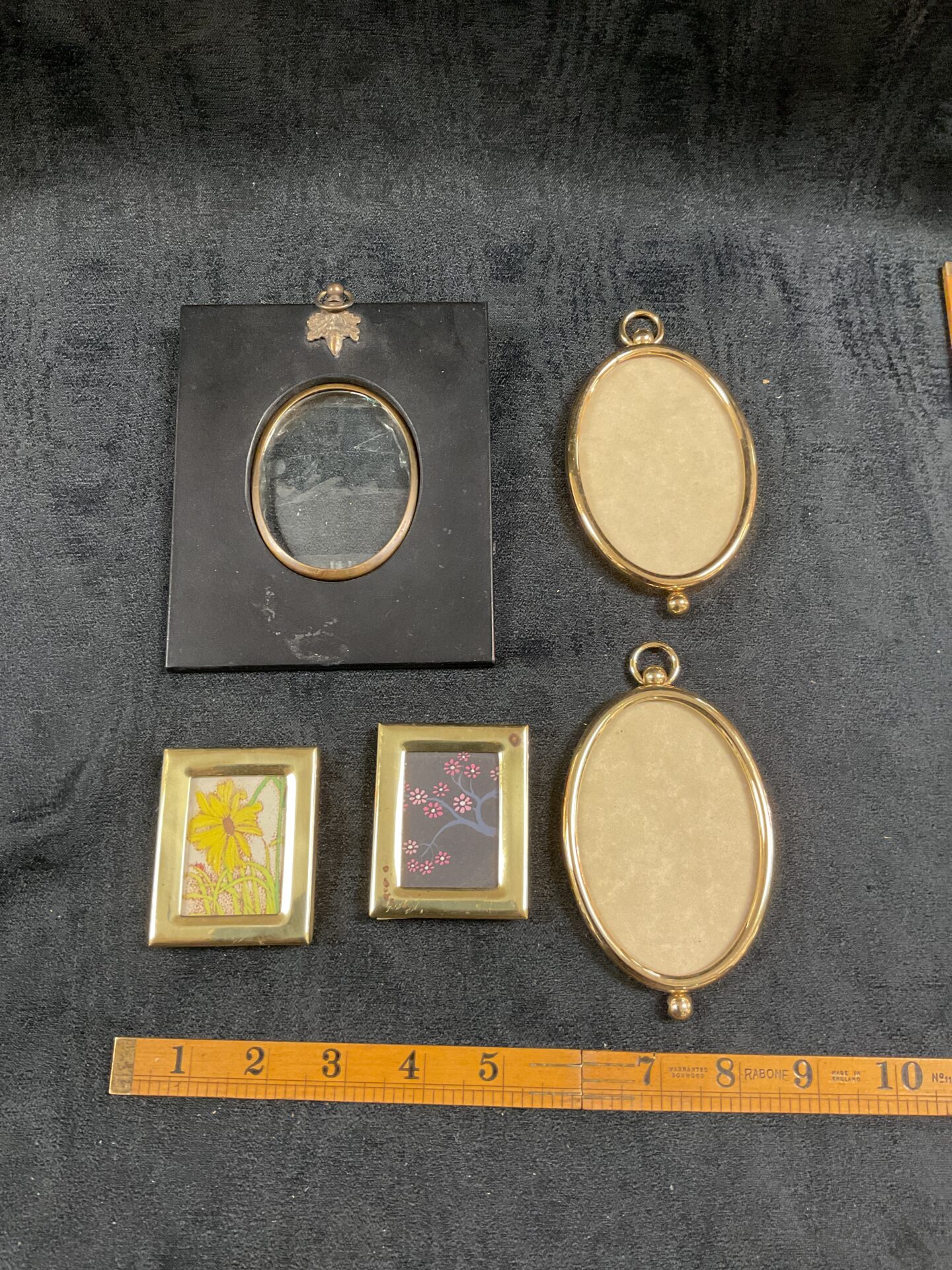 This lot comprises five miniature picture frames, each with an oval shape and a gilt finish. The frames exhibit varying degrees of ornate detailing, suggesting they were crafted for displaying small portraits, photographs, or keepsakes. Their diminutive size and decorative style are characteristic of Victorian and Edwardian-era accessories, intended for personal display within homes.