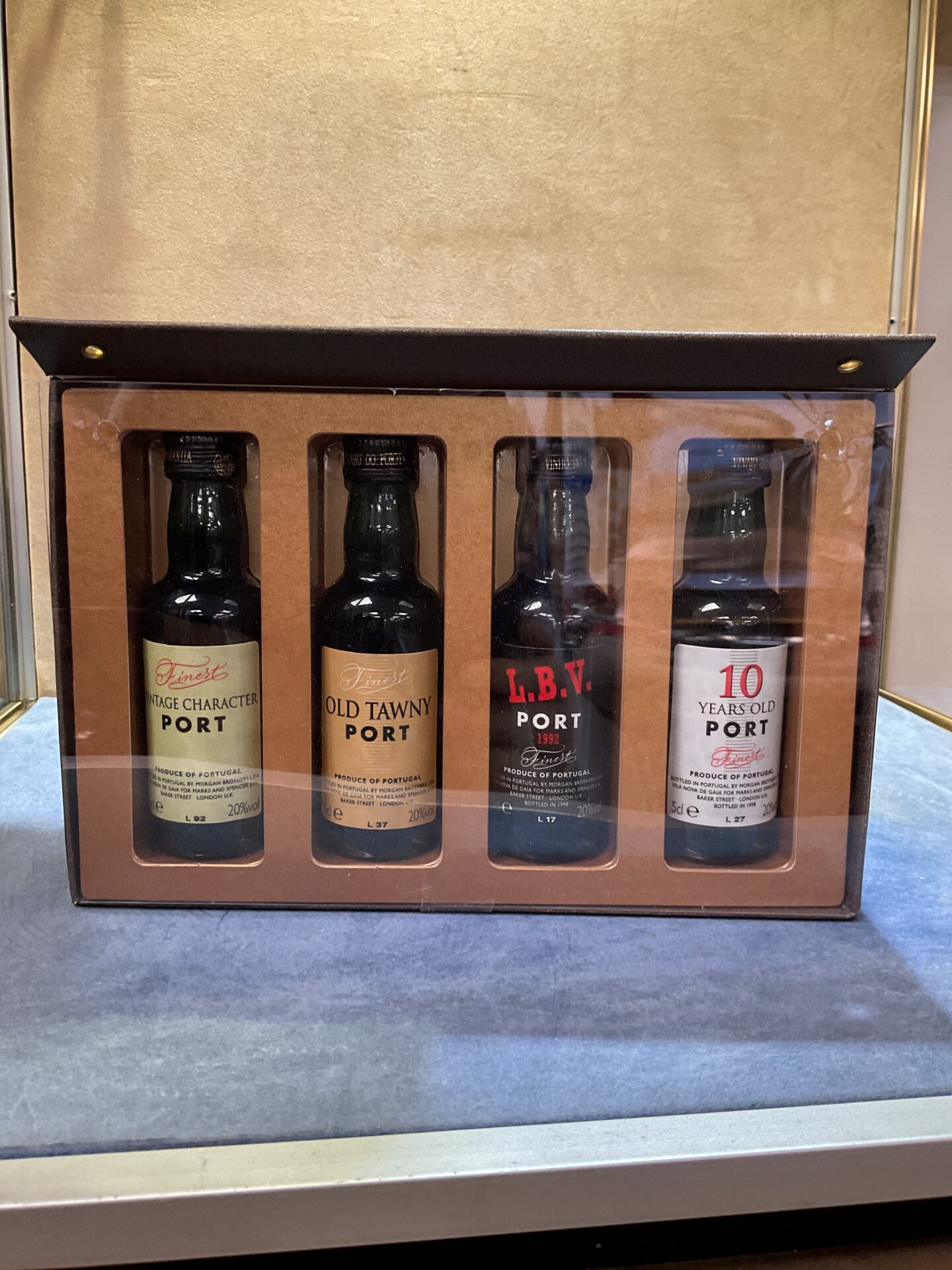 This is a collection of four miniature bottles of fine port wine. The set includes examples labelled ‘Vintage Character Port’, ‘Old Tawny Port’, ‘L.B.V. Port 1983’, and ‘10 Year Old Port’. These miniature bottles offer a glimpse into the world of port wine, showcasing different styles and ages, and are ideal for the discerning collector or enthusiast.
