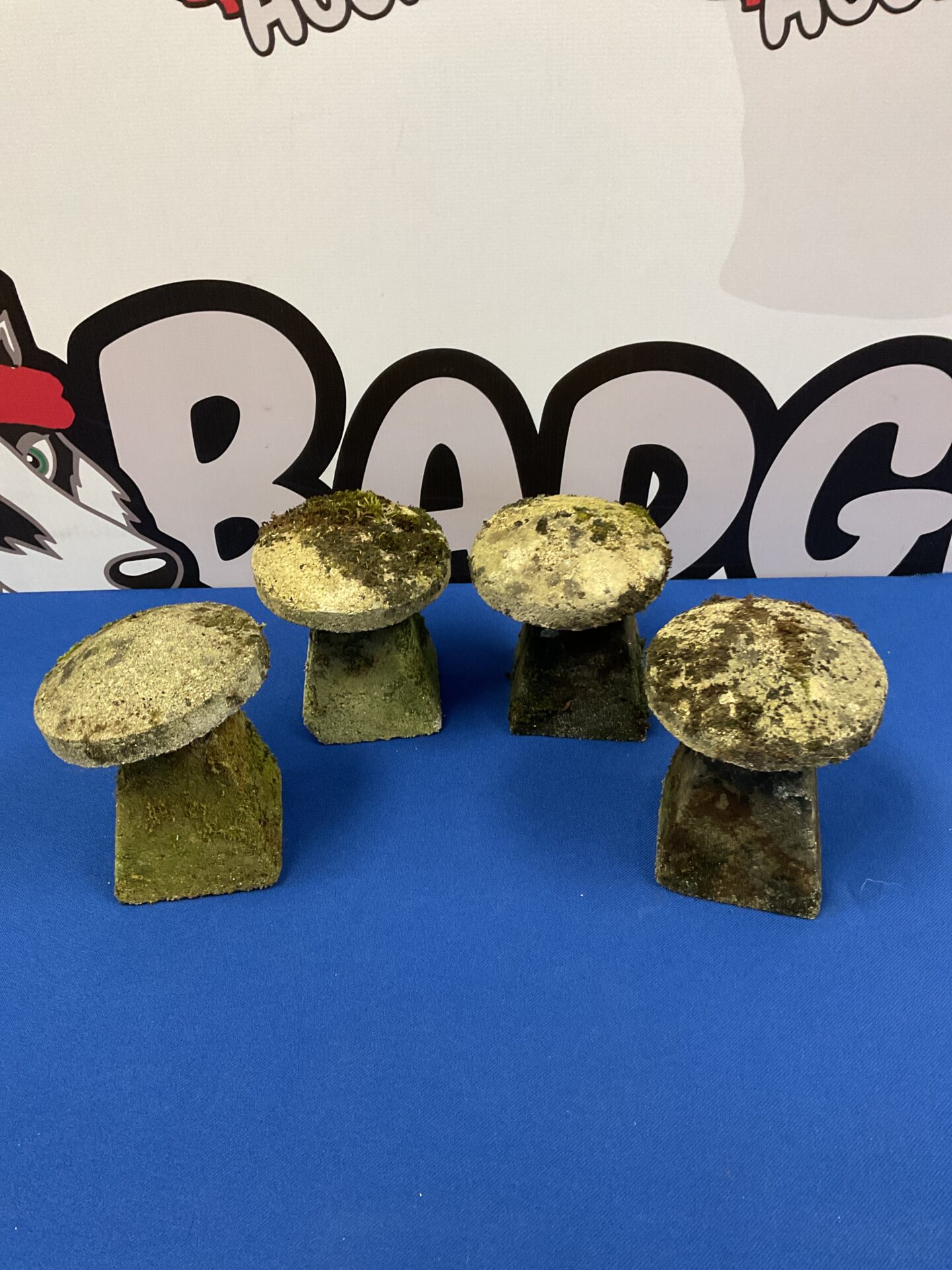 These are four miniature staddle stones, traditionally used to lift granaries and hayricks off the ground, protecting them from damp and rodents. Crafted from stone, these examples are scaled-down representations, likely created as decorative garden ornaments or collectible folk art pieces. Their weathered appearance suggests age and authenticity, though they are clearly not full-sized functional supports.