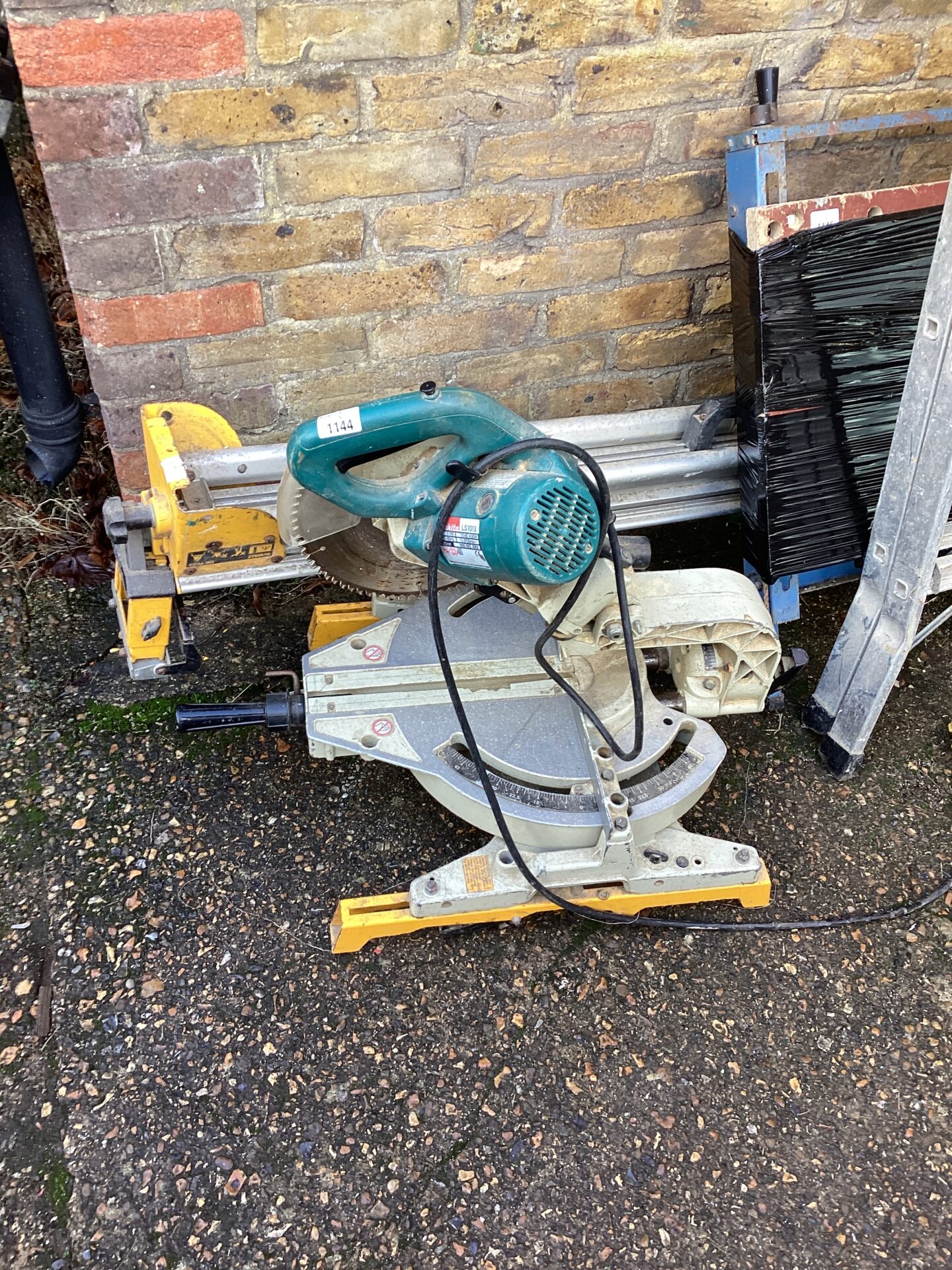 This lot features a Dewalt mitre saw stand paired with a Makita mitre saw. The stand provides a stable base for the saw, enhancing accuracy and ease of use during cutting tasks. The Makita mitre saw is a robust power tool designed for precise angled cuts in wood and other materials, commonly used in woodworking and DIY projects.