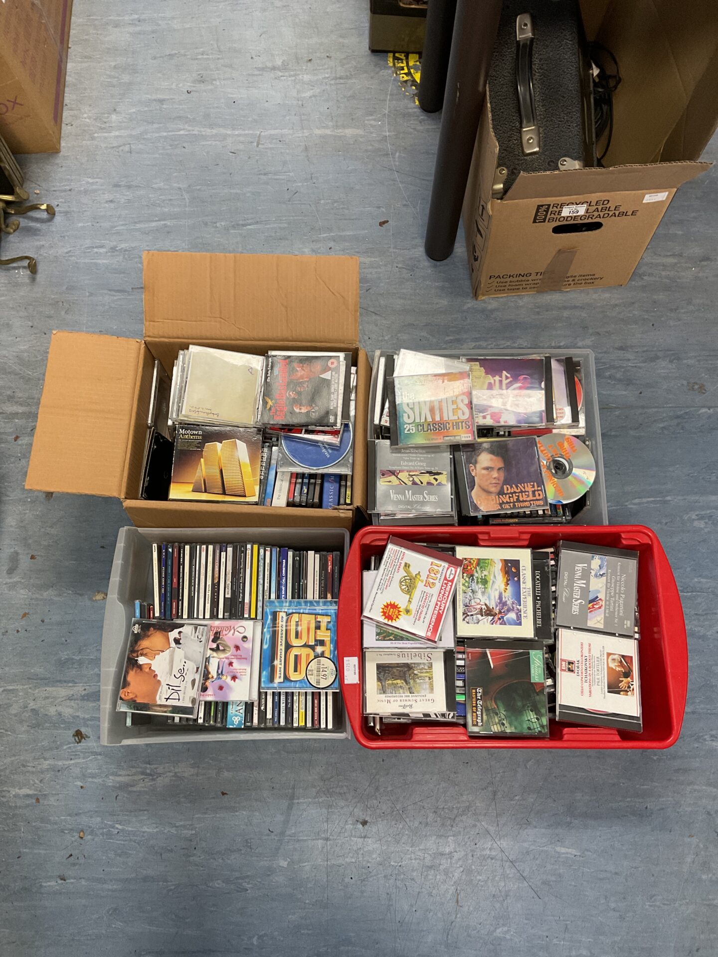 This lot comprises four boxes filled with a diverse collection of compact discs. The collection appears to span various genres and artists, offering a broad range of musical tastes. The CDs are housed within their standard jewel cases, presenting a nostalgic glimpse into the era of physical music media.