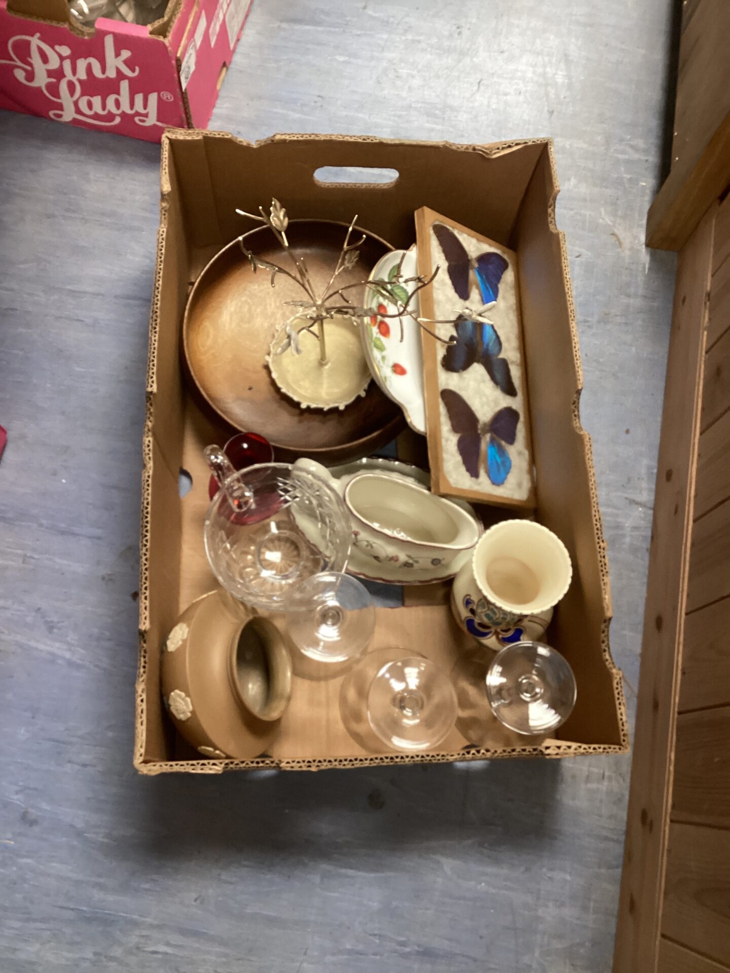 This mixed lot features a selection of vintage china pieces, including items from Royal Doulton and Honiton. The collection includes various serving dishes and decorative pieces, alongside a charming butterfly picture. This diverse assortment offers a blend of classic elegance and whimsical charm, perfect for collectors or those seeking unique decorative items.
