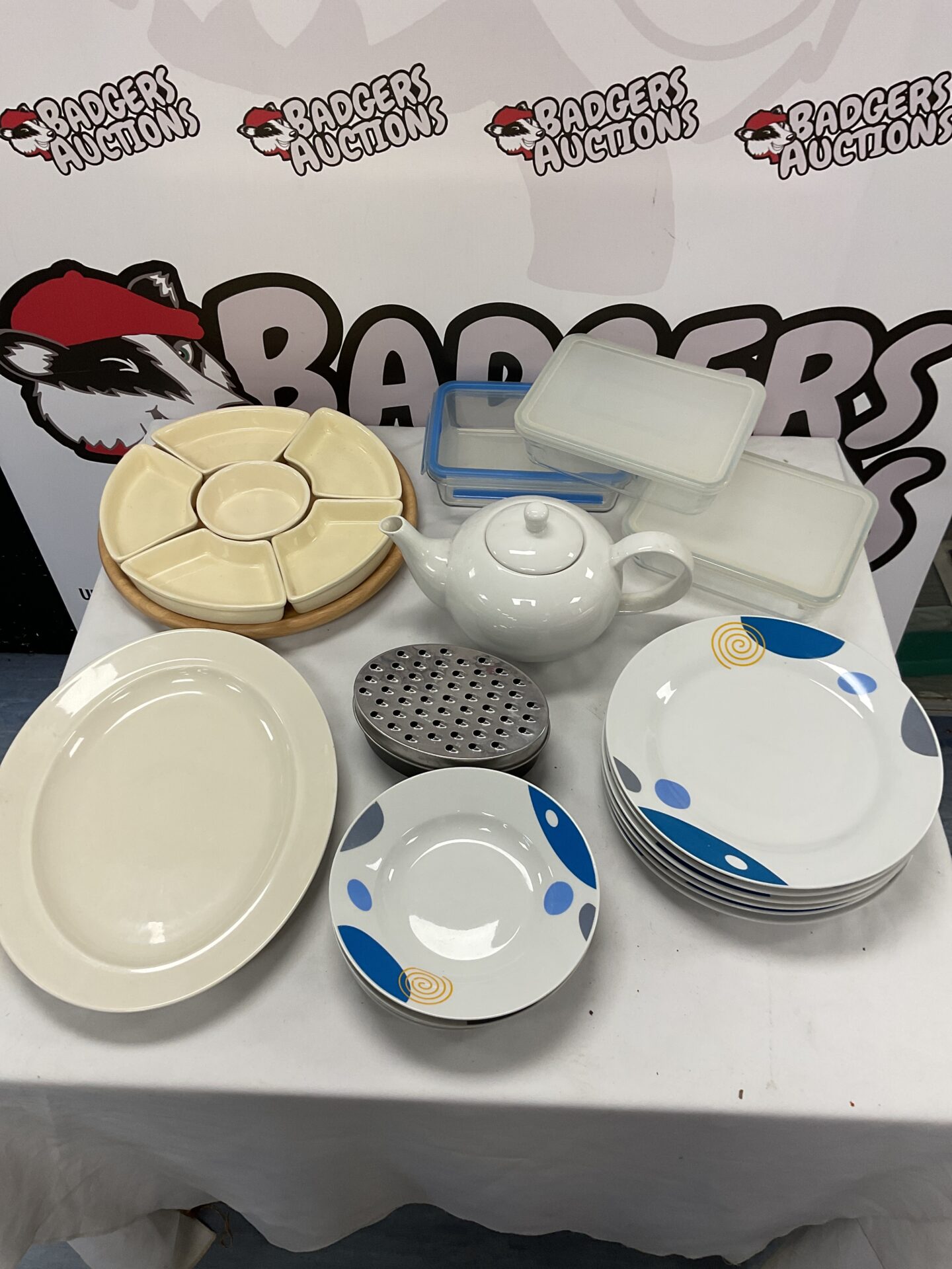 This lot comprises a selection of mixed china and pottery items, including a Dunelm teapot and an Alessin meat plate. A lazy susan is also included within the lot. The pieces showcase a variety of styles and patterns, offering a diverse collection for enthusiasts or those looking to add to their existing tableware.