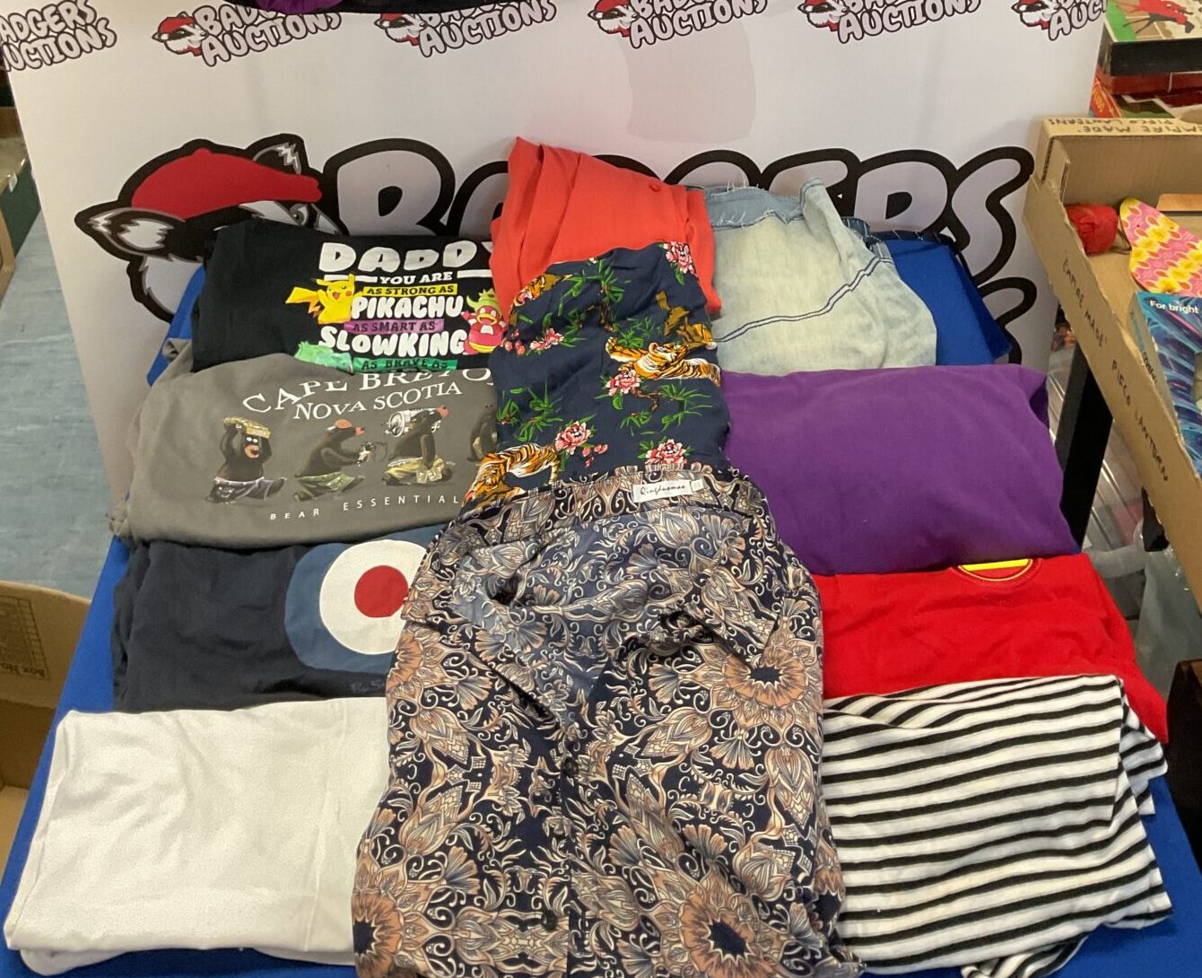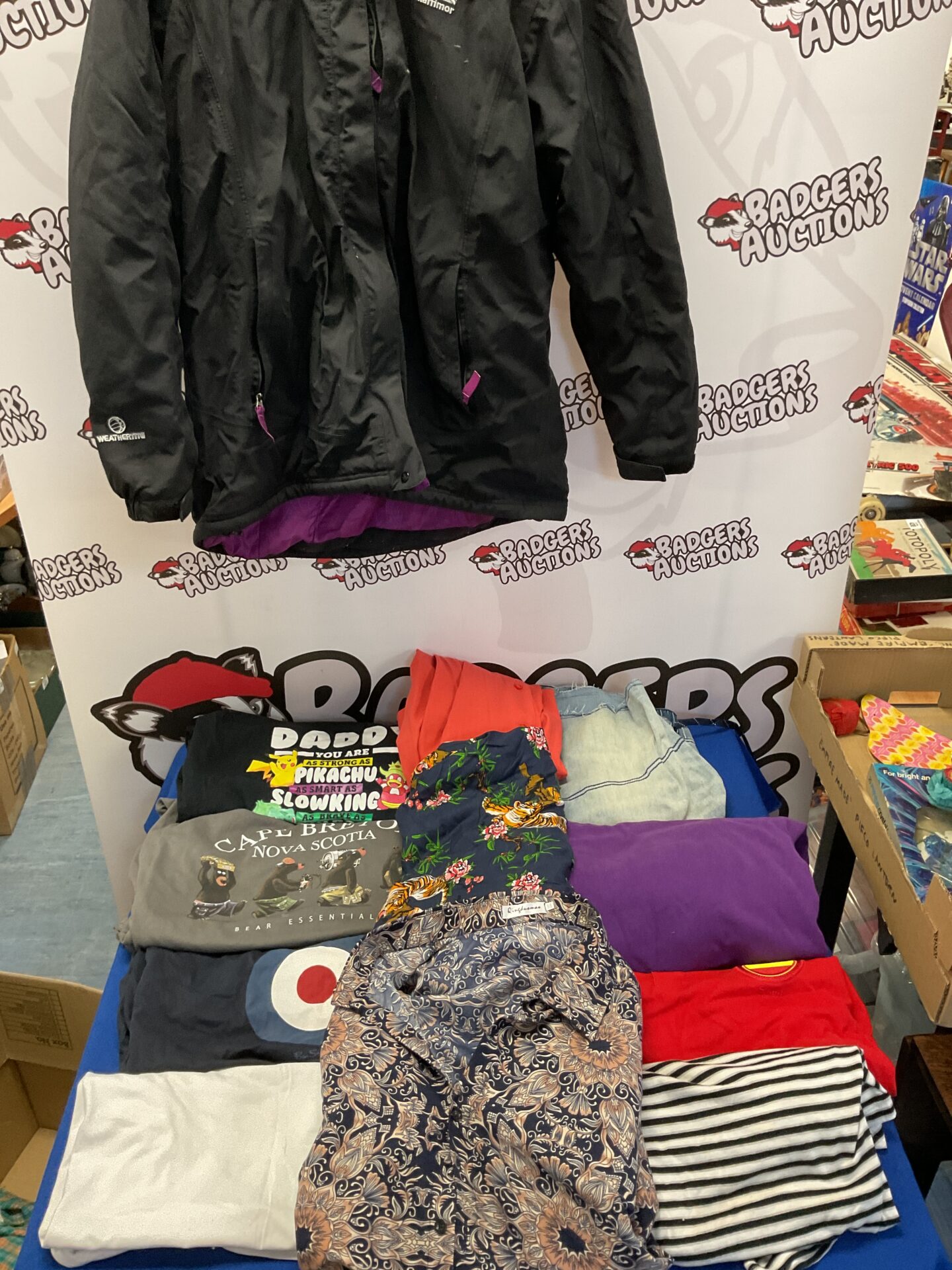The clothing appears to be pre-owned, with varying degrees of wear. While the items are not new, they present an opportunity for practical use or potential upcycling. This lot may appeal to buyers seeking affordable clothing options, those interested in outdoor wear, or collectors of branded items like Karrimor and Levi’s.